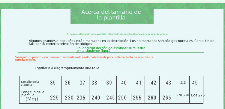 | Tamaño | 35,36,37,38,39,40,41,42,43,44,45 Estándar nacional |