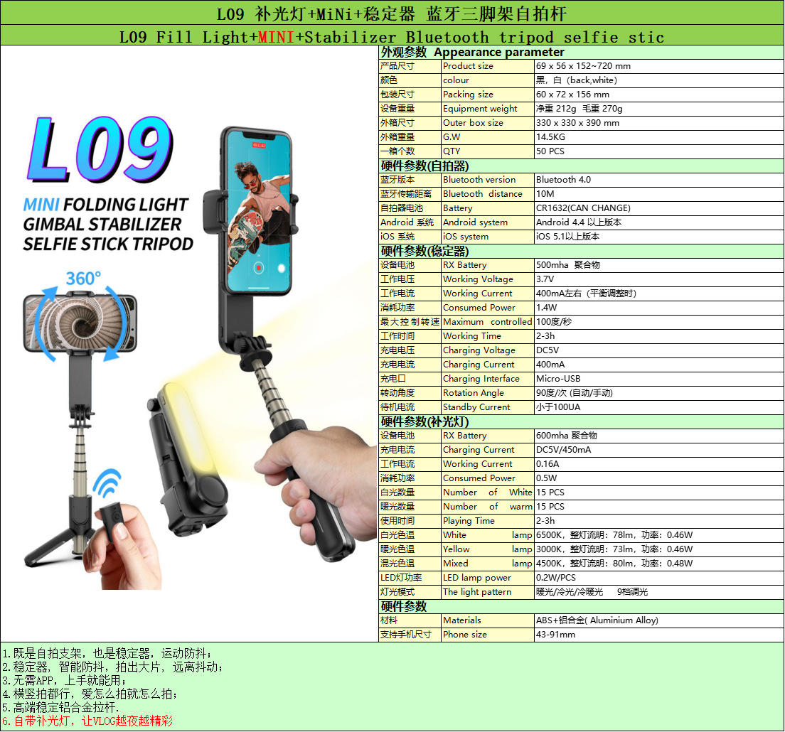 | Colores | Dispositivo de estabilización de PTZ de luz suplementaria L09 [negro],L09 estabilizador de PTZ de luz suplementaria [blanco] |