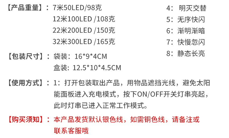 | Especificaciones | 8 Función 7 m 50 luces (línea de plata),8 Función 12 m 100 luces (línea de plata),8 Función 22 m 200 luces (línea de plata),8 Función 32 m 300 luces (línea de plata),2 Función 7 m 50 luces (línea de plata),2 Función 12 m 100 luces (línea de plata),2 Función 22 m 200 luces (línea de plata),8 Función 2 m 20 luces (línea de plata) |