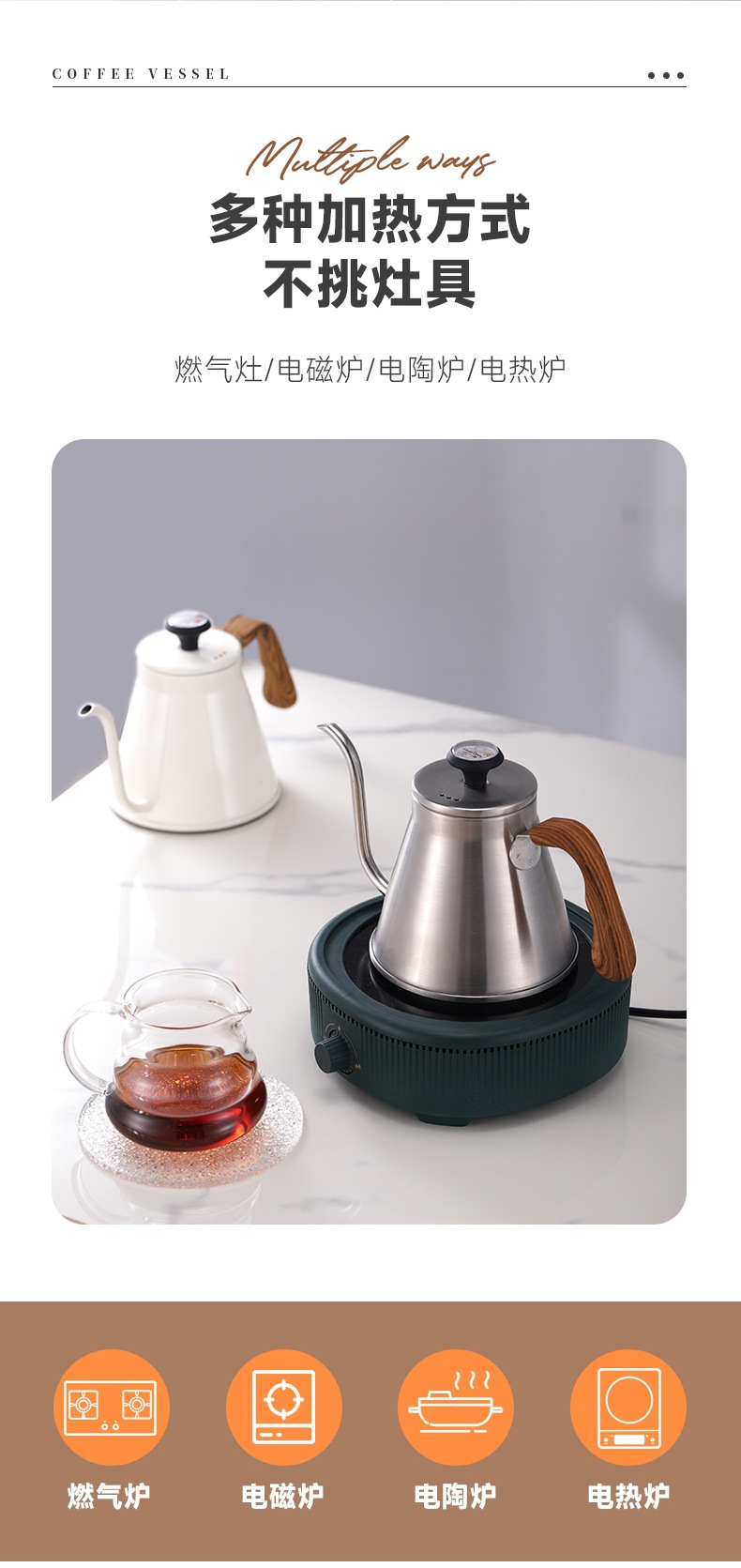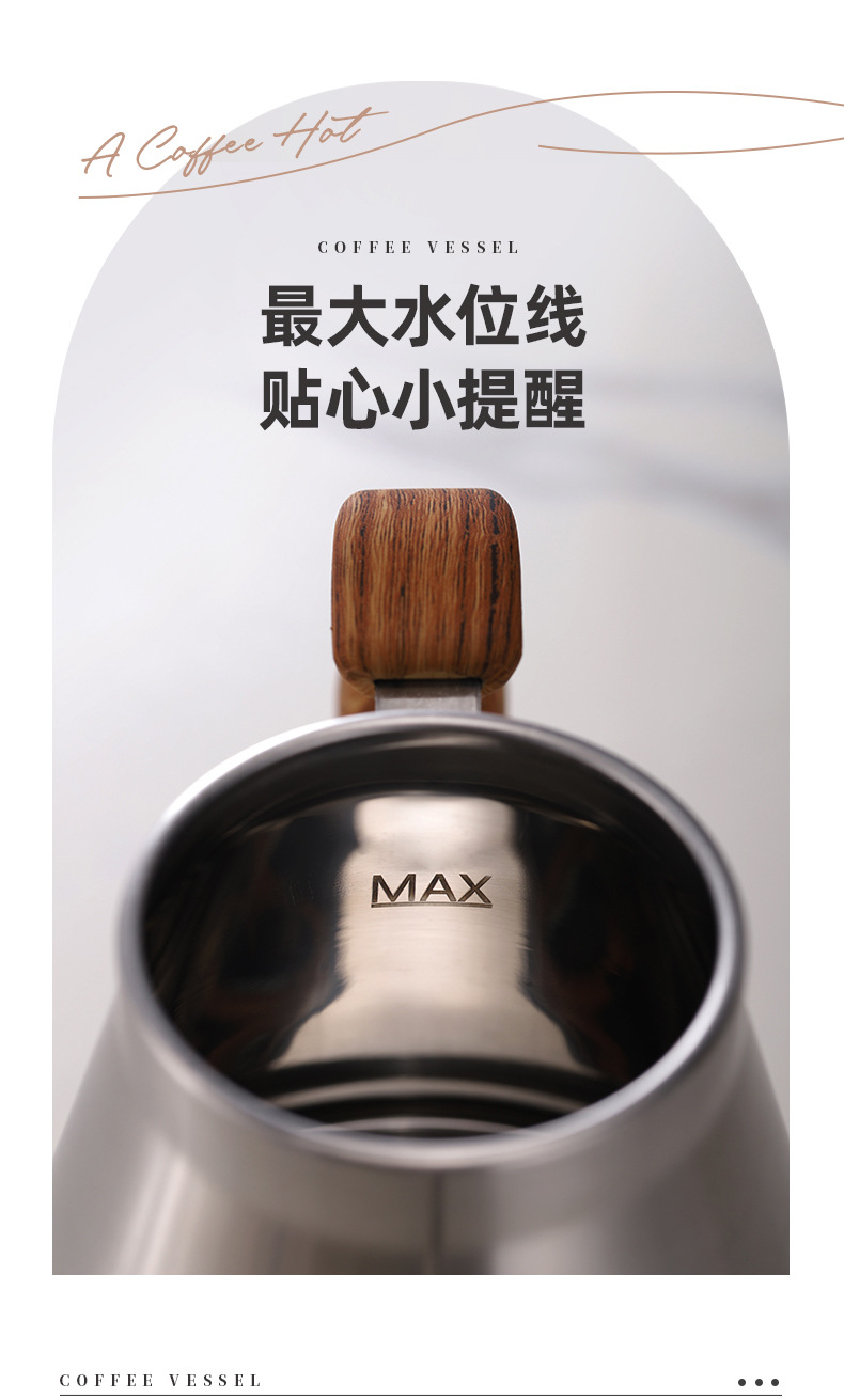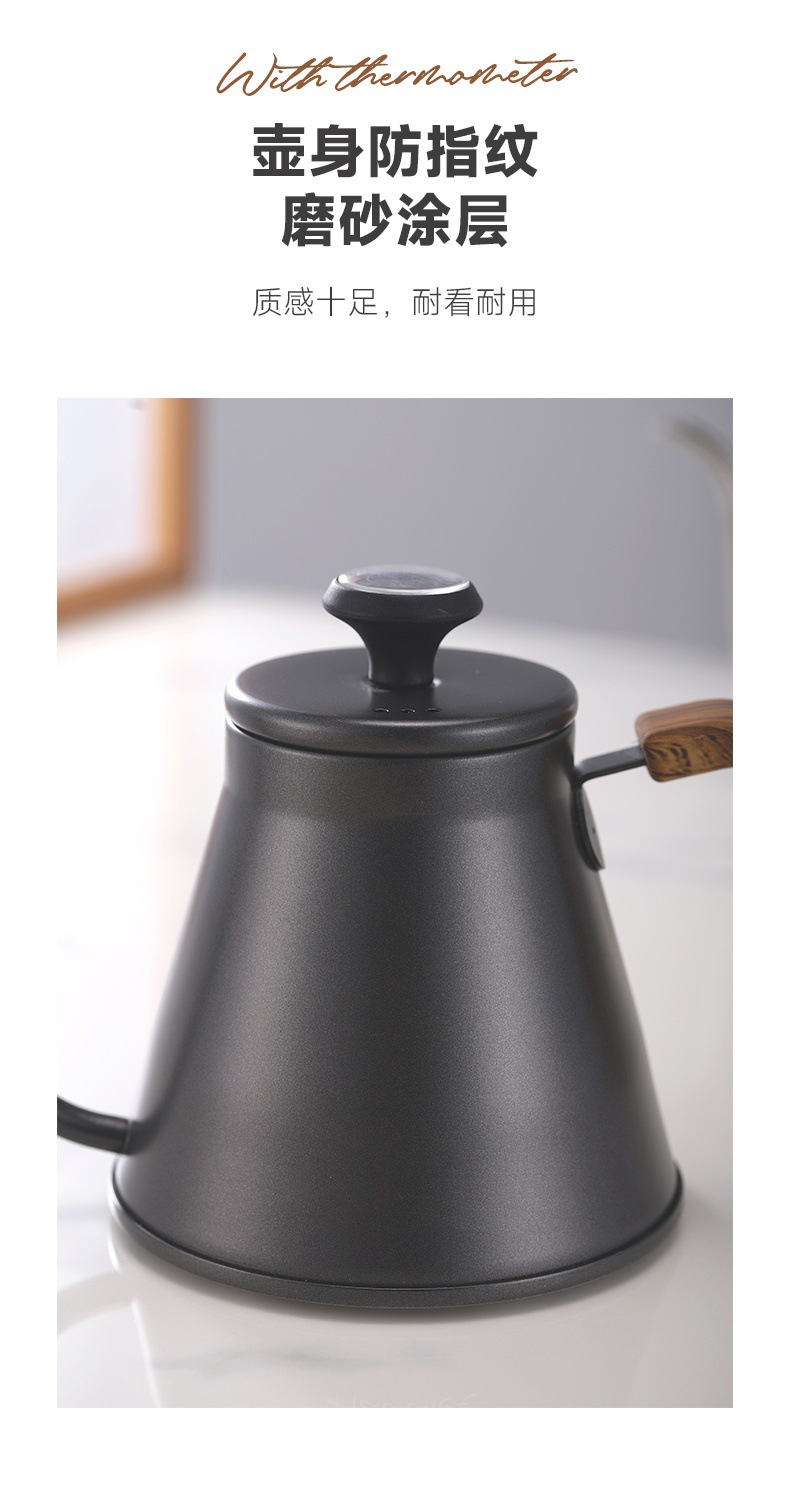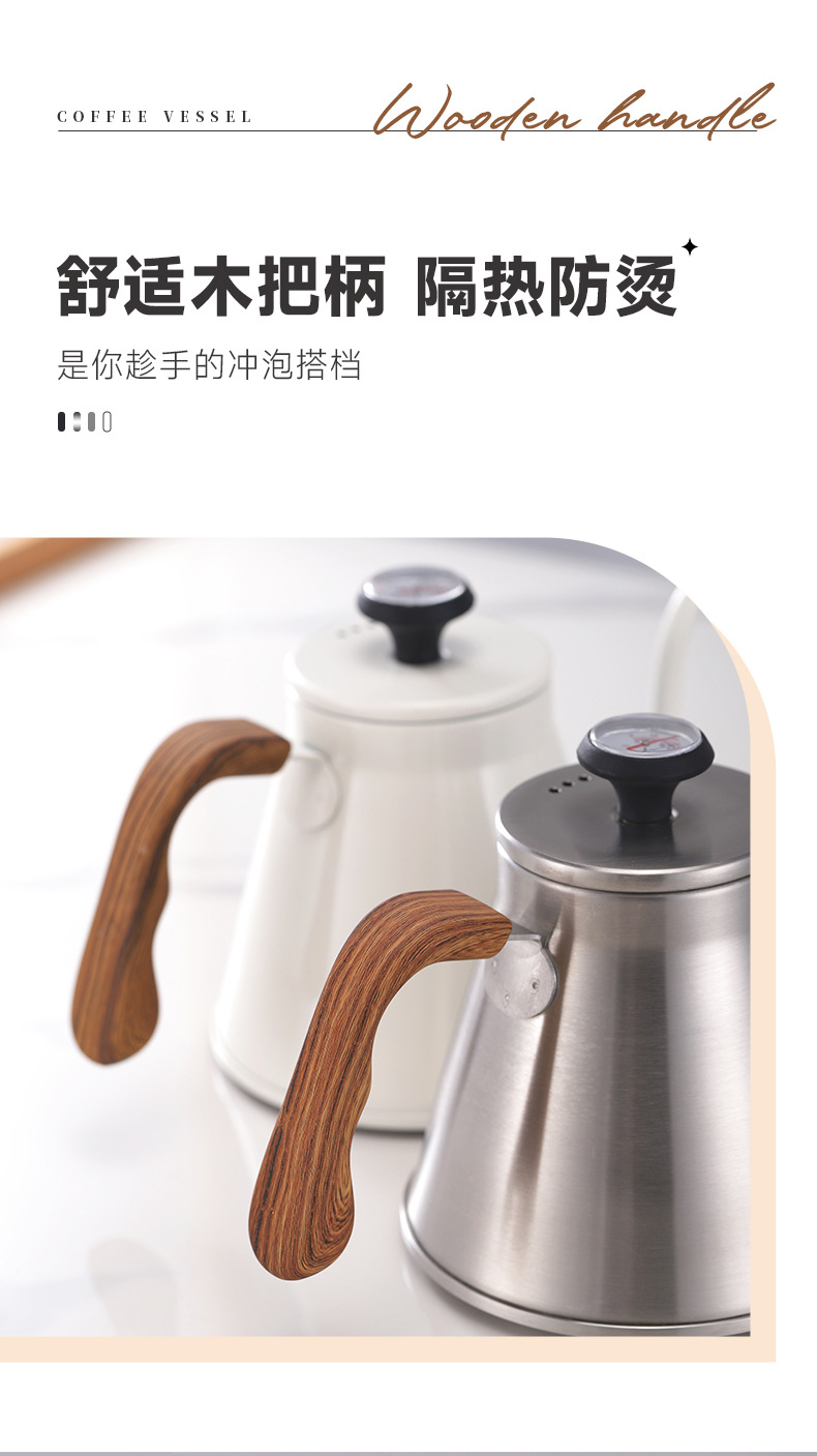 Hogar de acero inoxidable café mano olla estilo occidental boca delgada boca larga mango de madera con tapa tetera de leche colgando tetera de goteo del oído
