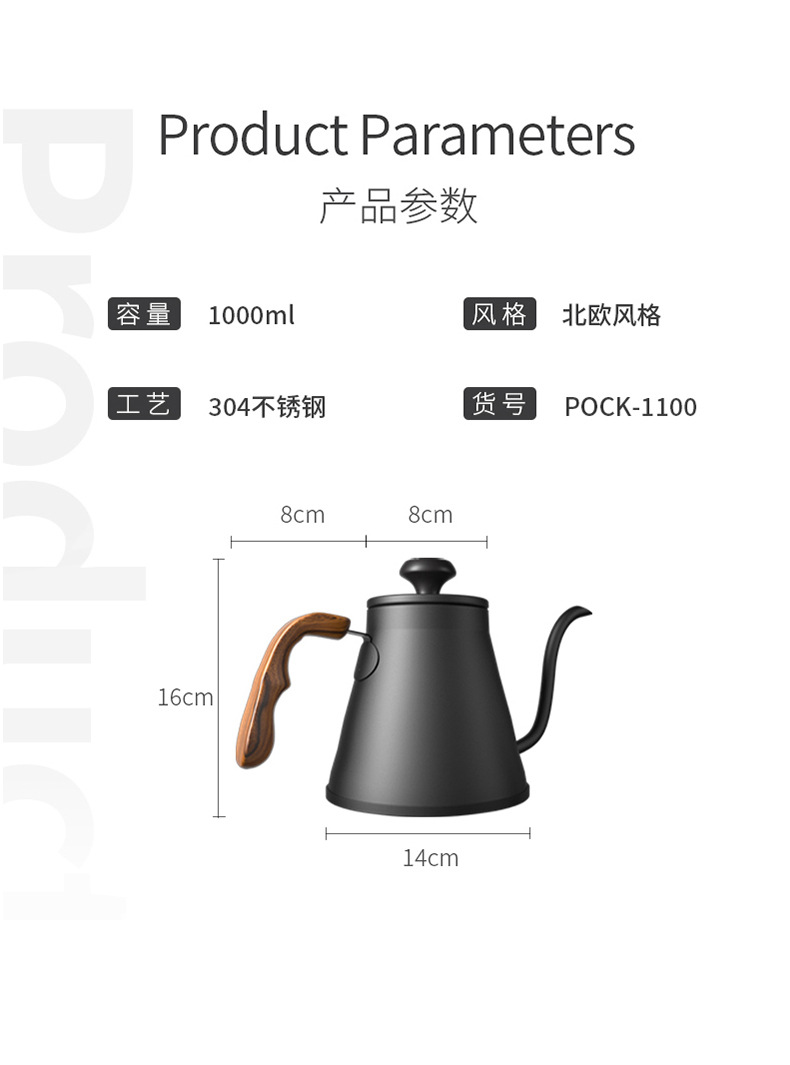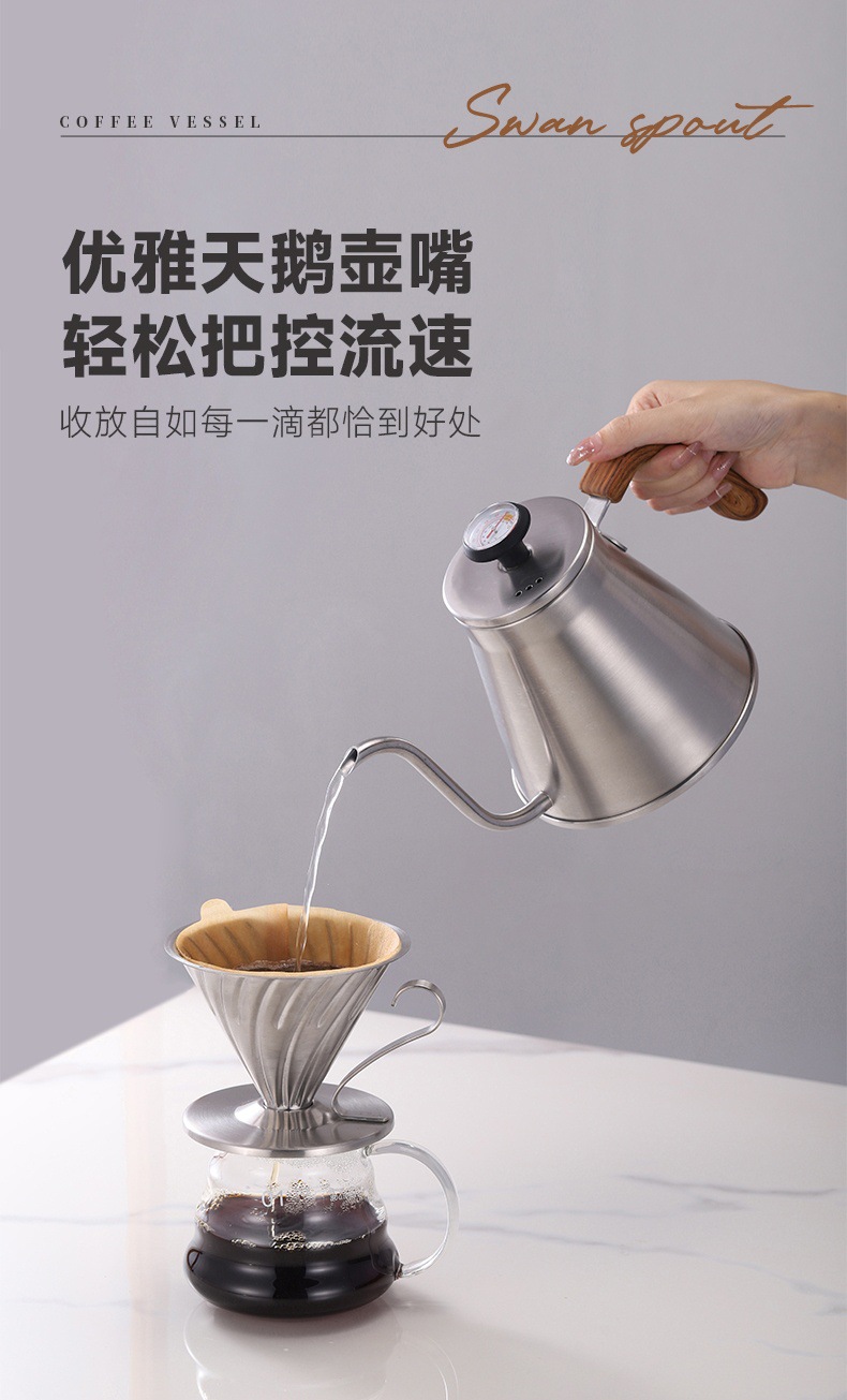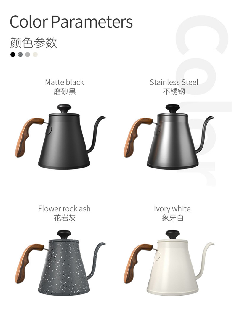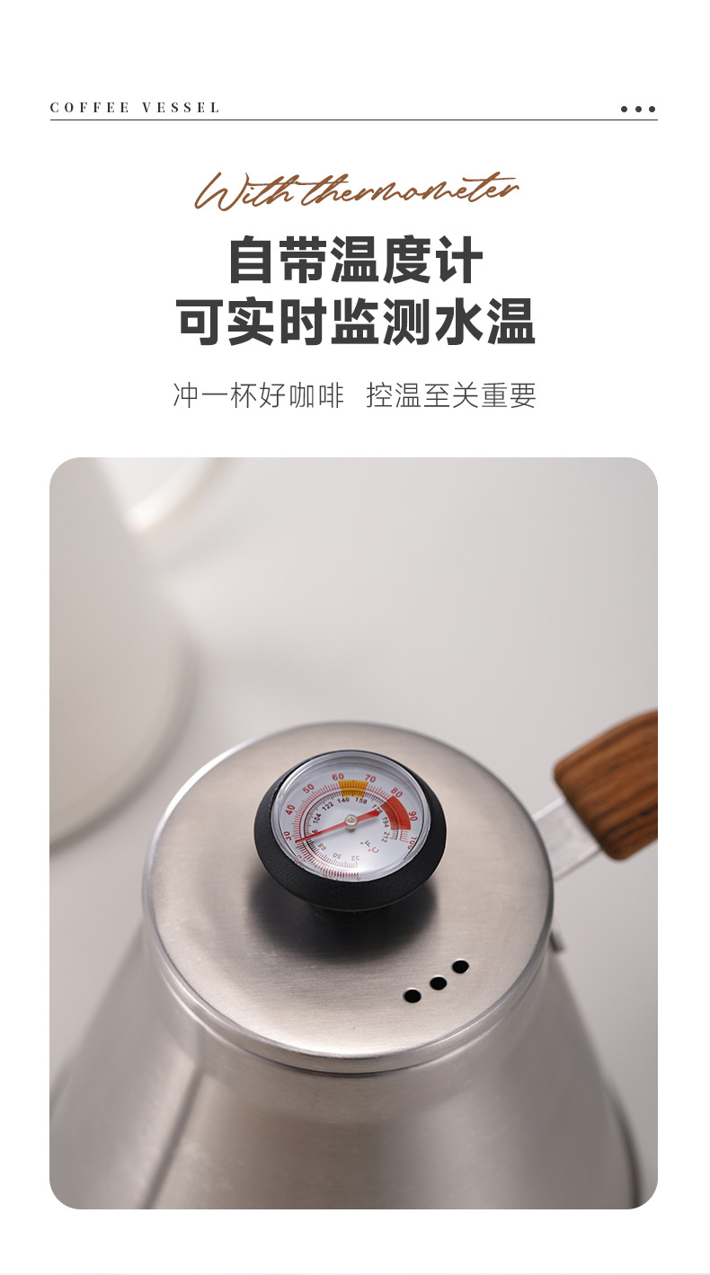 Hogar de acero inoxidable café mano olla estilo occidental boca delgada boca larga mango de madera con tapa tetera de leche colgando tetera de goteo del oído