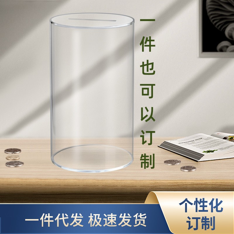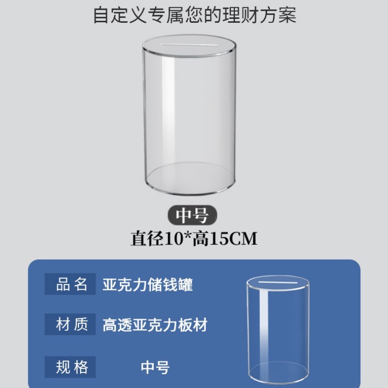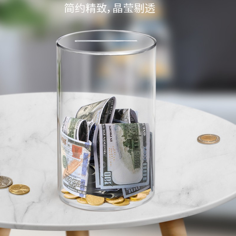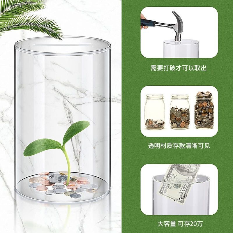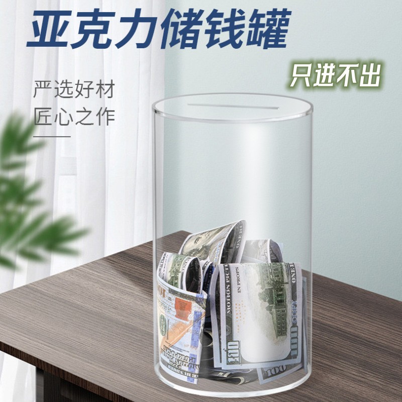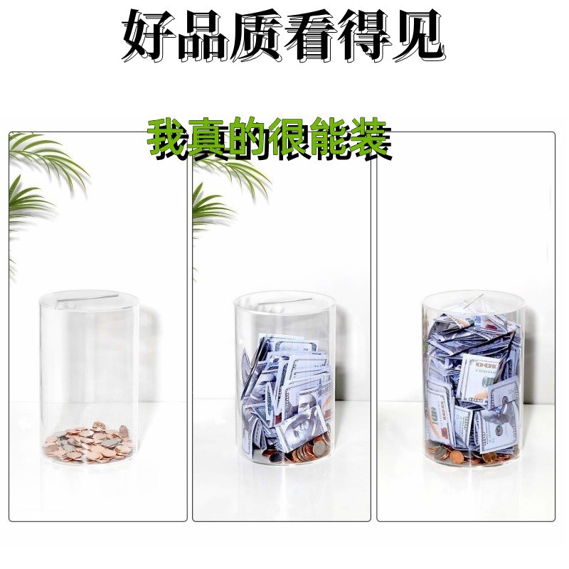 全新进口亚克力存钱罐,尺寸直径10CM高15CM,只存不出,开口是宽5mm*长80mm