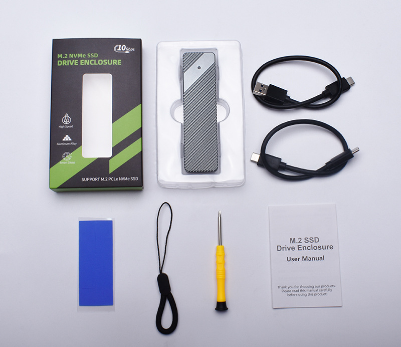 Packing list: M.2 SSD Enclosure, A to C high-speed cable, C to C high-speed data cable, Thermal silicone pad, Screwdriver, Lanyard, Chinese and English instruction manual
