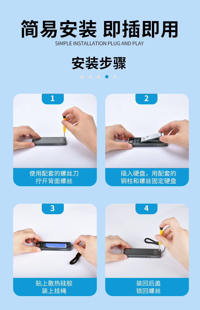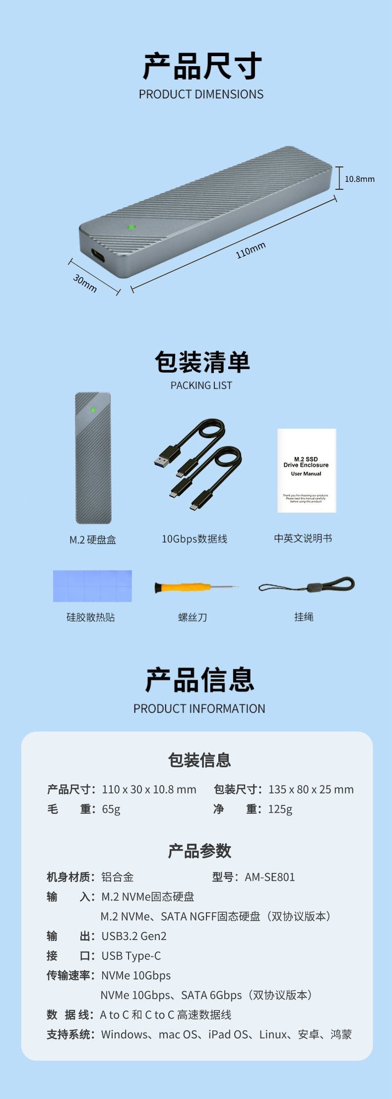 包装清单:M.2固态硬盘盒、A to C高速数据线、C to C高速数据线、导热硅胶片、螺丝刀、挂绳、中英文说明书