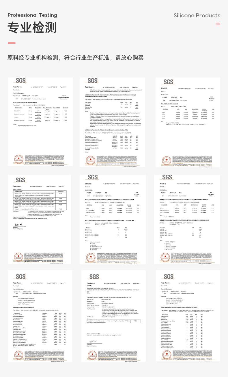 1.材料:采用食品级硅胶材质制作,通过SGS质检,可以直接与人接触(RoHS,Reach,SGS,FDA)。