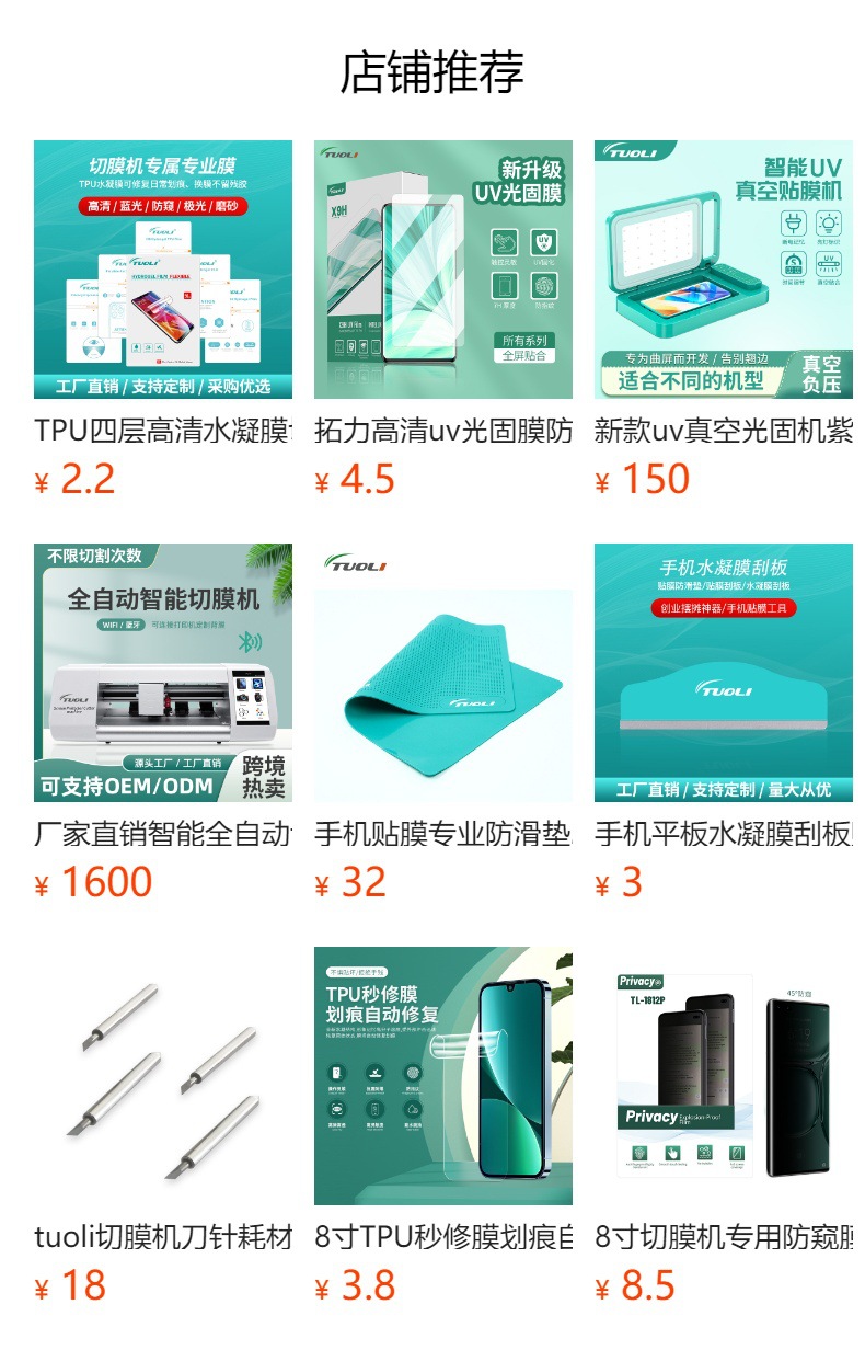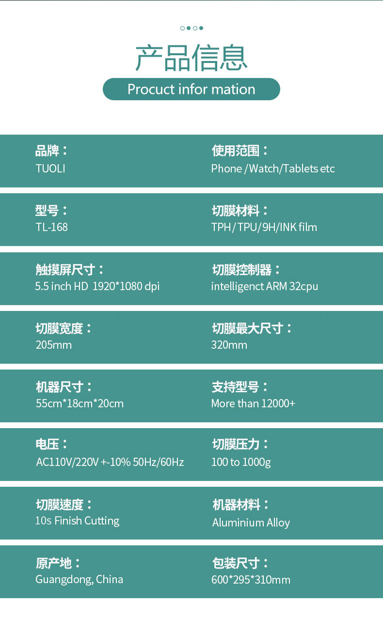 | Colores | Máquina cortadora de película con pantalla táctil WiFi inteligente TL-168plus (12,9 pulgadas) (estándar nacional),Máquina cortadora de película con pantalla táctil WiFi inteligente TL-168plus (12,9 pulgadas) (EE. UU.),Máquina cortadora de película con pantalla táctil WiFi inteligente TL-168plus (12,9 pulgadas) (estándar británico),Máquina cortadora de película con pantalla táctil WiFi inteligente TL-168plus (12,9 pulgadas) (estándar europeo),TL-568max(16 pulgadas) estándar de EE. UU.,Estándar nacional de TL-568max(16 pulgadas),TL-568max(16 pulgadas) estándar británico,TL-568max(16 pulgadas) estándar europeo,TL-518,Máquina cortadora de película neutra de 13 pulgadas,Película HD para teléfono móvil 4A 180*120mm (un paquete de 50 piezas),4A película mate para teléfono móvil 180*120mm (un paquete de 50 piezas),4A película azul del teléfono móvil 180*120mm (un paquete de 50 piezas),Juego de película a base de agua 180*120mm (un paquete de 50 piezas),Membrana sin costuras 180*120mm (un paquete de 50 piezas),Película de alta definición 4A11 pulgadas 300*200 (un paquete de 50 piezas),Película mate de 4A11 pulgadas 300*200 (un paquete de 50 piezas),Película azul 4A11 pulgadas 300*200 (un paquete de 50 piezas),Película de alta definición 4A13 pulgadas 330*225 (un paquete de 50 piezas),Película mate de 4A13 pulgadas 330*225 (un paquete de 50 piezas),Película anti-azul de 4A13 pulgadas 330*225 (un paquete de 50 piezas),Tableta de 16 pulgadas HD 410*290mm (un paquete de 50 piezas),Placa de 16 pulgadas esmerilada 410*290mm (un paquete de 50 piezas),Blu-ray plano de 16 pulgadas 410*290mm((un paquete de 50 piezas),Película HD para teléfono móvil (importación) 180*120mm (paquete de 50 piezas),Película mate para teléfono móvil (importación) 180*120mm (paquete de 50 piezas),Película Blu-ray para teléfono móvil (importación) 180*120mm (paquete de 50 piezas),Película plana HD (importación) 300*200mm (paquete de 50 piezas),Película mate plana (importación) 300*200mm (paquete de 50 piezas),Película azul plana (importación) 300*200mm (paquete de 50 piezas),Película de curado UV 180*120mm(100 piezas),Película HD a prueba de explosiones (100 piezas),Película mate a prueba de explosiones (100 piezas),Juego de película de corte,Impresora de bricolaje G580,Película HD 2A (50 piezas),Película mate 2A (50 piezas),Película de luz azul 2A (50 piezas) |