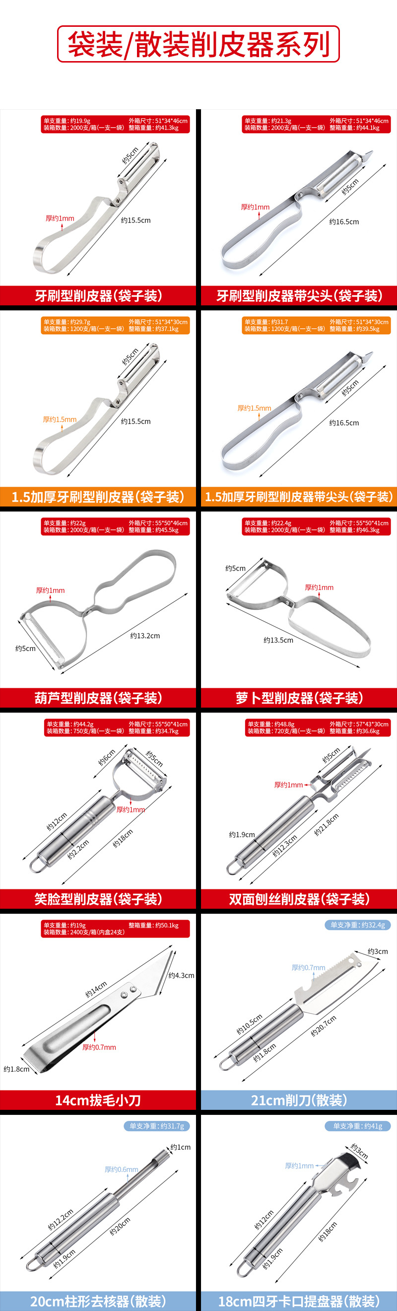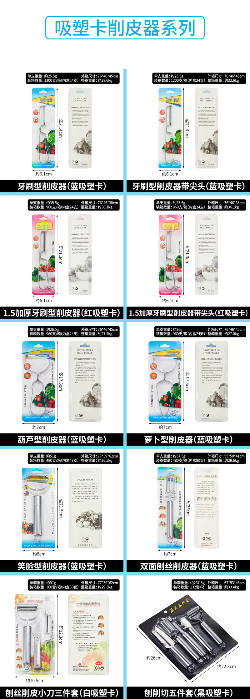 | Especificaciones | Peeler tipo calabaza (bolsa),Pelador de rábano (bolsa),Cepillo de dientes pelador (sin cabeza puntiaguda) bolsa,Cepillo de dientes Peeler (con cabeza puntiaguda) bolsa,Cuchillo de boca plana mango de arco cepillo de dientes pelador (tarjeta de ampolla amarilla),Pelador de rábano cuchillo plano (tarjeta de la ampolla blanca),Pelador de cepillo de dientes (tarjeta blister azul),Pelador de dientes con cabeza puntiaguda (tarjeta blister azul),Pelador de tipo calabaza (tarjeta de la ampolla azul),Pelador de rábano (tarjeta blister azul),Peeler Smiley (tarjeta de blister azul),Pelador de rallador de doble cara (tarjeta de ampolla azul),Cuchillo pelador rallador de tres piezas (tarjeta blister blanca),1,5 pelador de cepillo de dientes grueso (tarjeta roja de la ampolla),Pelador de cepillo de dientes de 1,5 gruesos con cabeza puntiaguda (tarjeta de ampolla roja),Juego de cinco piezas de cepillado y corte (tarjeta blister negra) |
