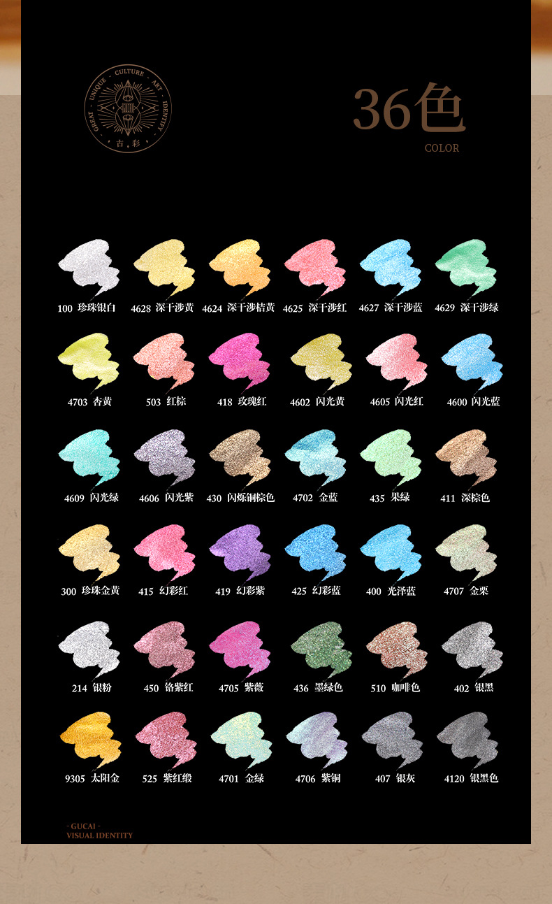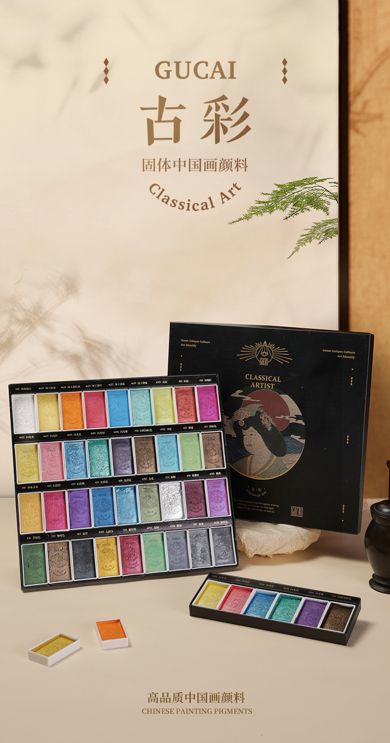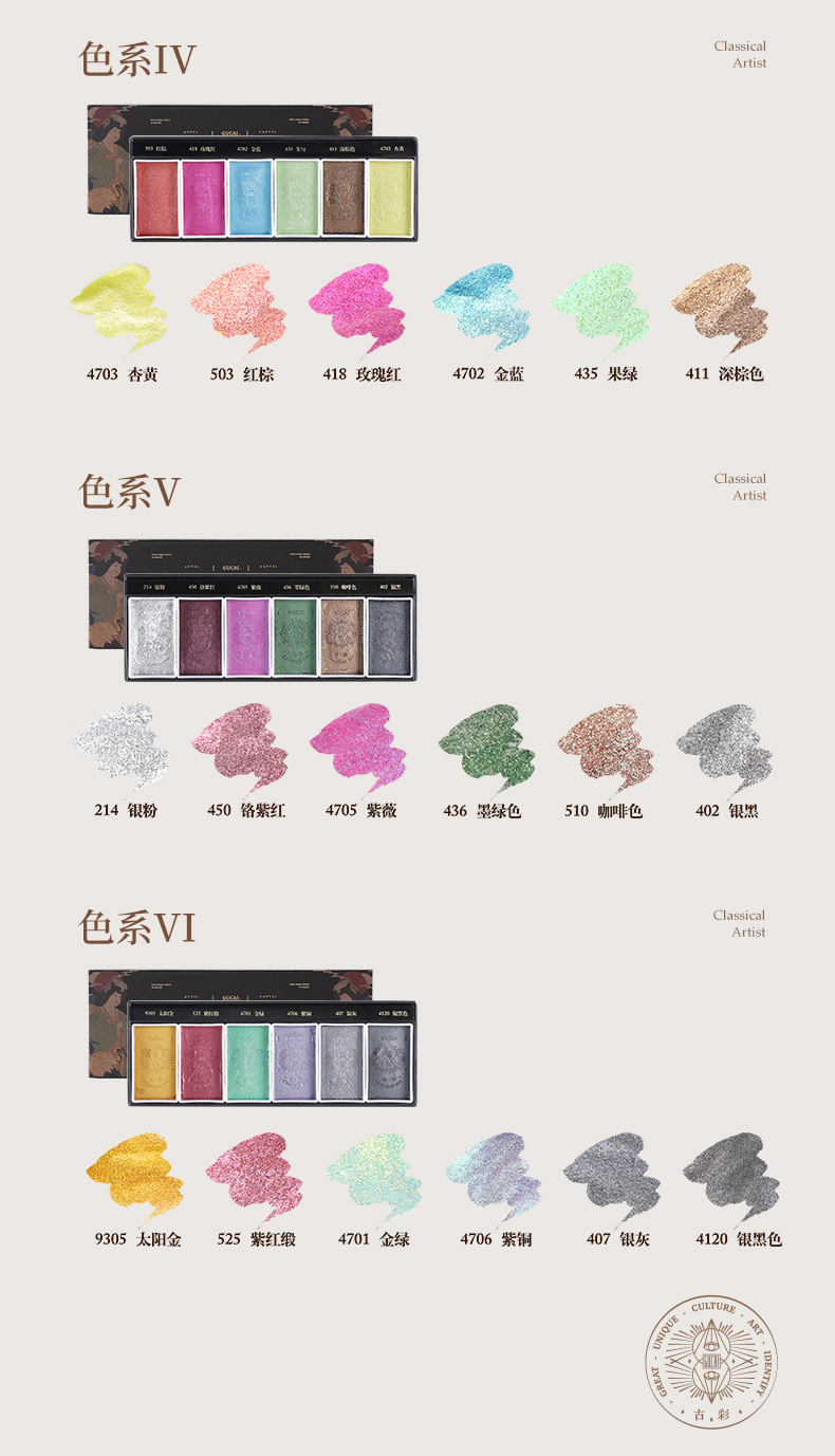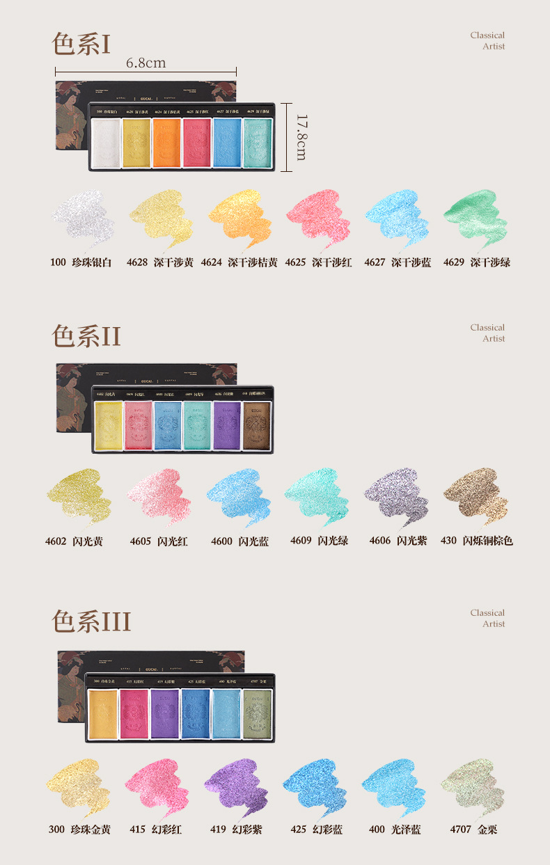 Color nacarado I [6 colores],Pearlescent II [6 colores],Color nacarado III [6 colores],Color nacarado IV [6 colores],Serie de color nacarado V [6 colores],Nacarado VI [6 colores],Traje sólido de pigmento nacarado [36 colores],Pintura China sólida del Chino-Grado 12 colores,Pintura china tradicional sólida del Chino-Grado 24 colores