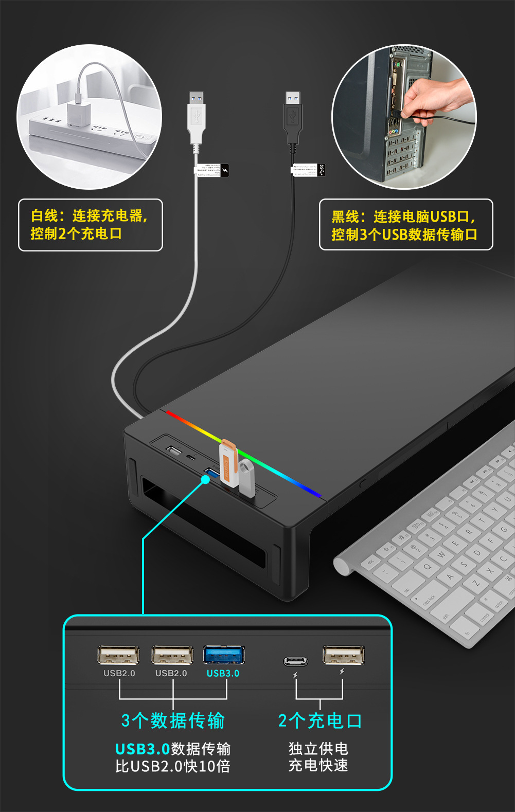 1:黑色数据线1.5米接电脑USB口,输出5V1A,接鼠标、键盘、U盘等;