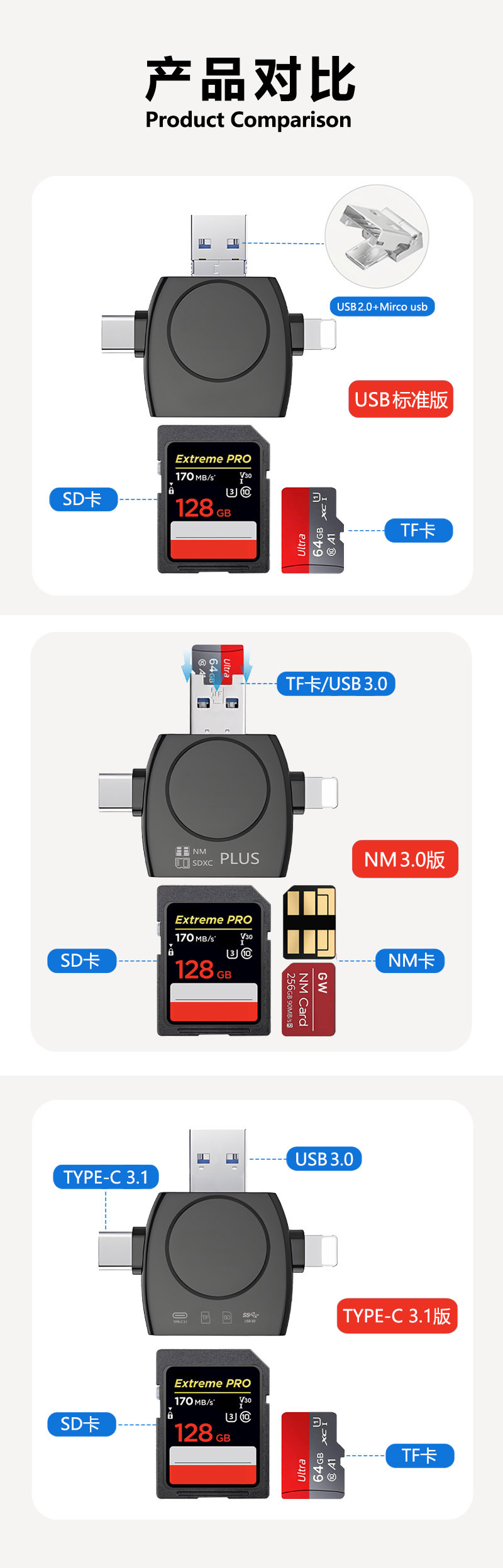 | Colores | Blanco redondo [leer TF SD] de alta calidad,Redondo Negro [Leer TF SD] Alta calidad,Blanco 3.0/3.1 Redondo [Leer TF SD] Alta velocidad completa,Negro 3.0/3.1 Redondo [Leer TF SD] Alta velocidad completa,Versión mejorada NM redondo blanco [Leer NM SD TF] 3.0,Versión mejorada NM redondo negro [Leer NM SD TF] 3.0,Edición de coleccionista blanca 7 en 1 [Leer TF SD USB TC multifunción] Lectura de 4 puertos,Edición de coleccionista negro 7 en 1 [Leer TF SD USB TC Multifunción] Lectura de 4 puertos,Blanco 701 [Leer TF SD USB TC Carga] Edición estándar,Negro 701 [Leer TF SD USB TC Carga] Edición estándar |