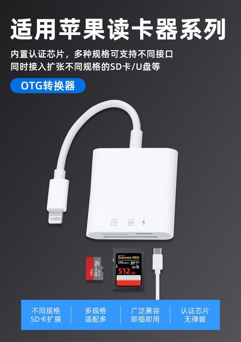 适用苹果手机14/13/12转三合一充电单反相机SD/TF内存读卡器批发