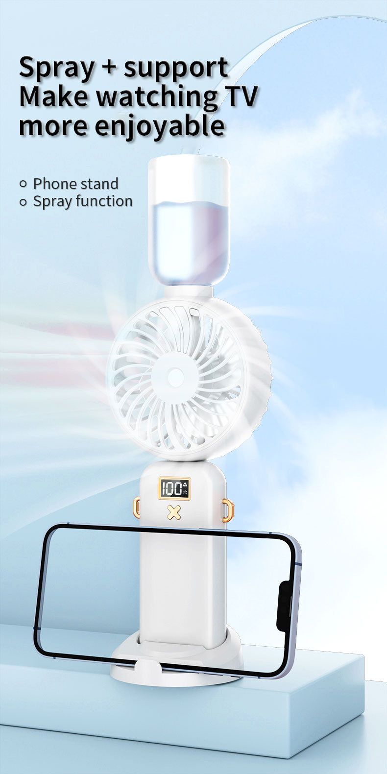 | Funciones adicionales | Pantalla de alimentación digital/plegable/spray/aromaterapia/de mano/cuello colgante/soporte para teléfono móvil/escritorio |