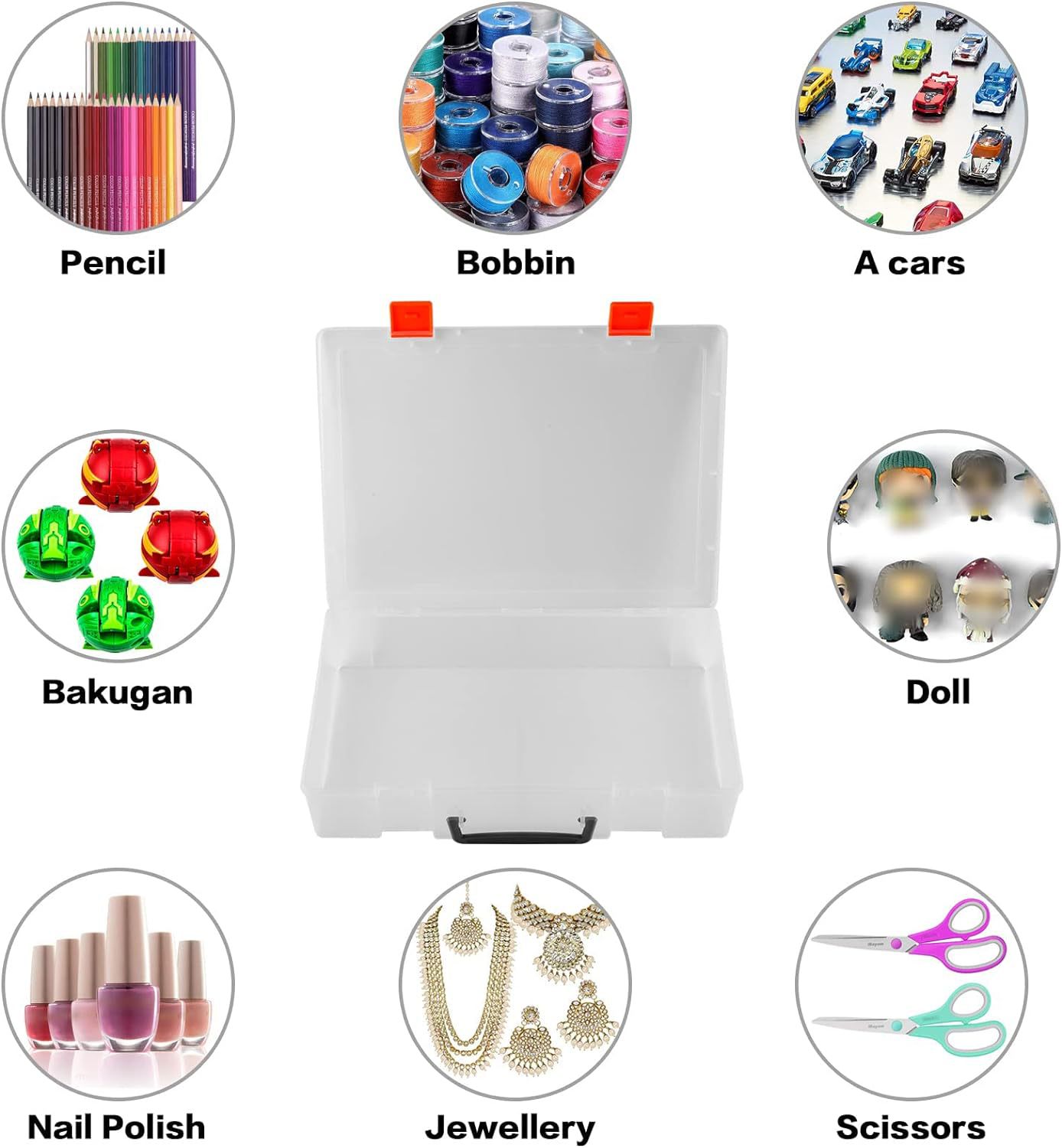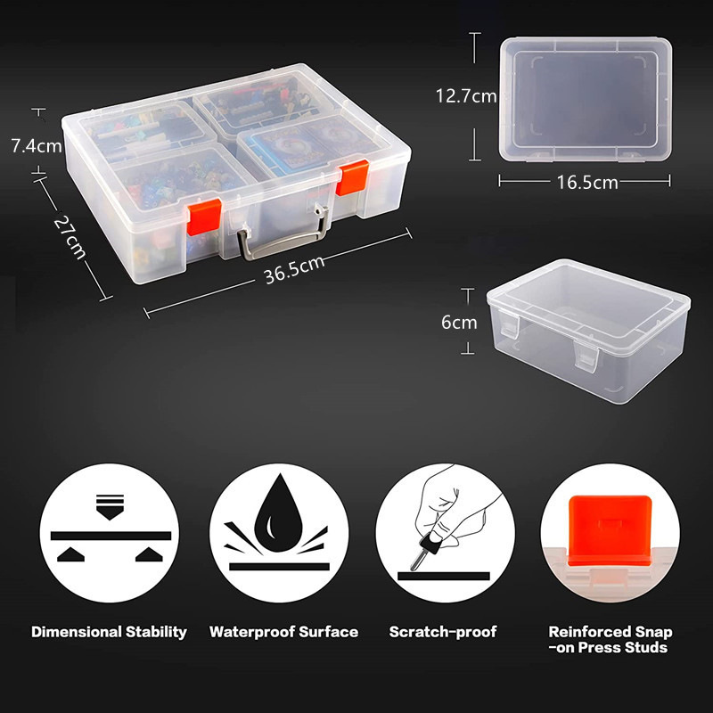 | Especificaciones | Caja grande transparente 1 4 juego de combinación de caja interior,Caja interior transparente (16.3*12.7*6cm,Caja interior transparente más partición (16,3*12,7*6cm,Caja exterior portátil transparente (36,5*27*7,4 cm |