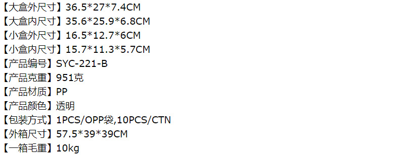 | Modelo de especificación | Caja grande transparente 1 4 juego de combinación de caja interior,Caja exterior portátil transparente (36,5*27*7,4 cm,Caja interior transparente (16.3*12.7*6cm,Caja interior transparente más partición (16,3*12,7*6cm |