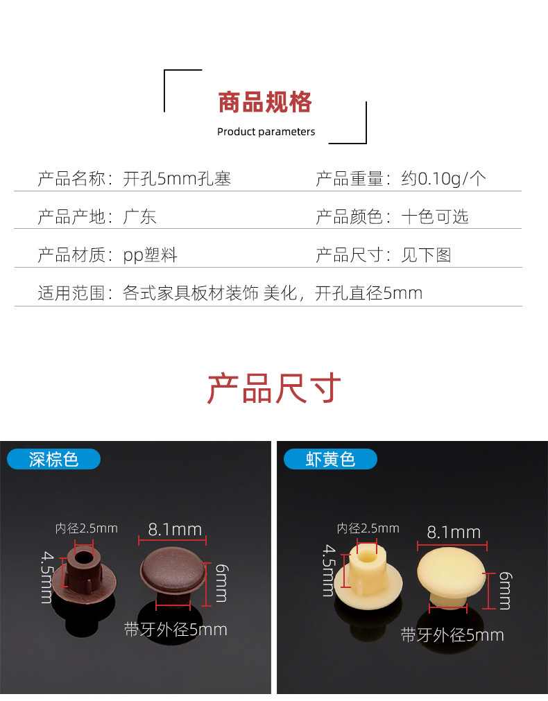 | Especificaciones | Tapón agujero 5mm Blanco,Tapón de agujero de 5mm,5mm agujero enchufe gris claro,Tapón de agujero de 5mm gris oscuro,5mm agujero tapón rojo marrón,5mm agujero tapón marrón oscuro,Tapón de agujero de 5mm negro,Tapón agujero 5mm beige,Tapón agujero 5mm Naranja,5mm agujero tapón Camarón amarillo |