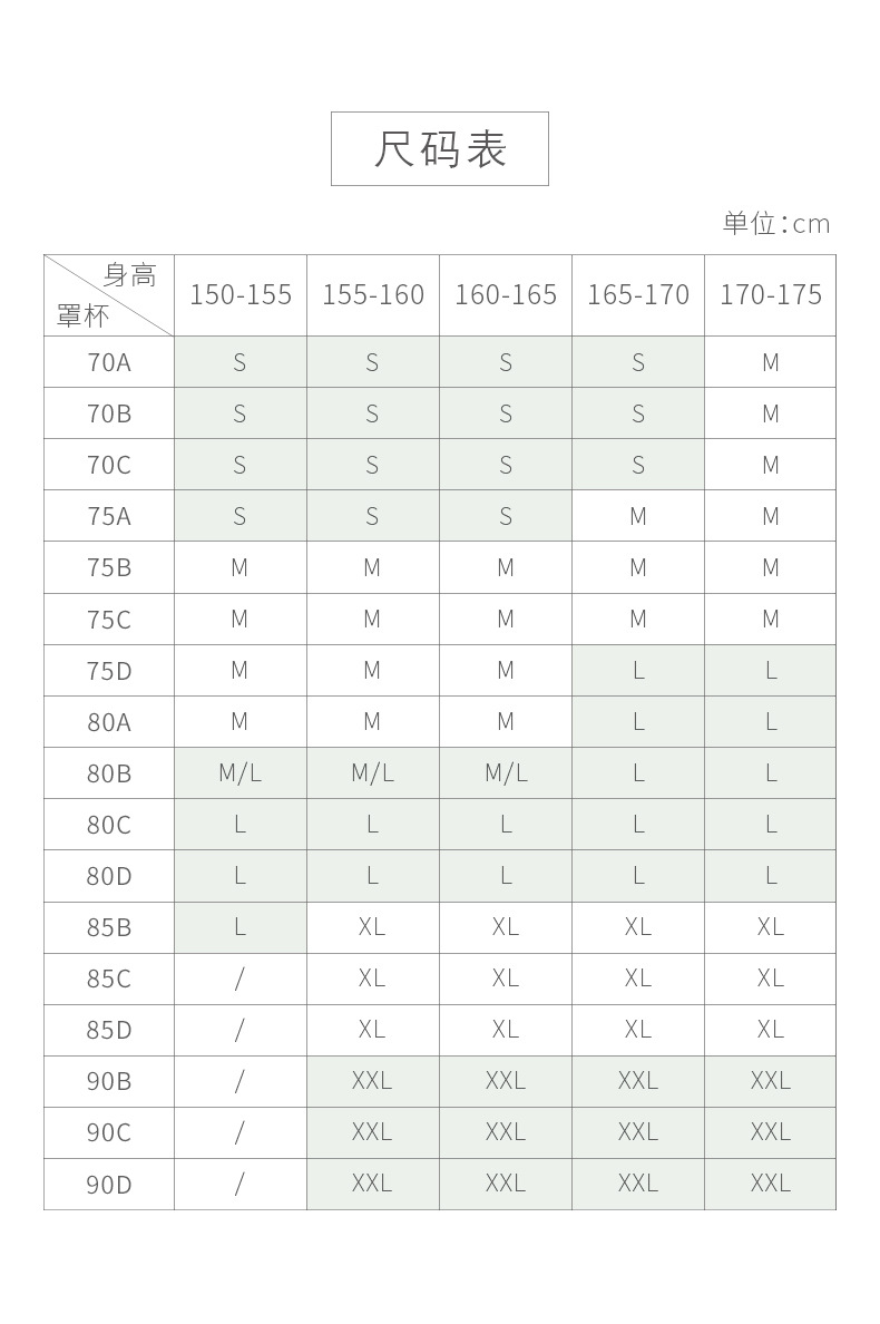 | Tamaño | Código S (adecuado para 32/70ABC),Código M (adecuado para 34/75ABC),Código L (adecuado para 36/80ABC),Código XL (adecuado para 38/85ABC),Código XXL (adecuado para 40/90ABC) |