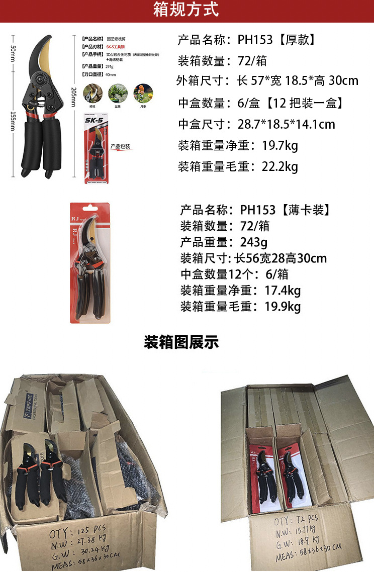 | Especificaciones | Tijeras de podar PH153 con mango de esponja negro (Empaque en blíster),Tijeras de podar con mango de esponja naranja PH153 (en tarjeta),Tijeras de podar PH153 con mango de esponja negro (Empaque en blíster),PH153 cuchilla original de resorte de podar con mango naranja [paquete de tarjeta],Tijeras de podar de esponja PH250 modificadas [bolsa OPP],Tijeras de podar de esponja PH250 [en caja],250 tijeras de podar con mango negro [paquete de tarjetas],250 tijeras de podar con mango rojo [bolsa OPP],250 tijeras de podar con mango rojo [en caja],250 tijeras de podar con mango rojo [paquete de tarjeta] |