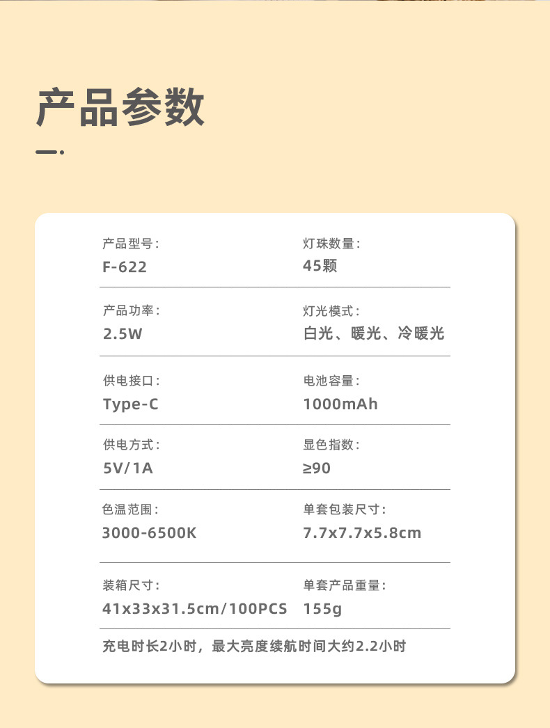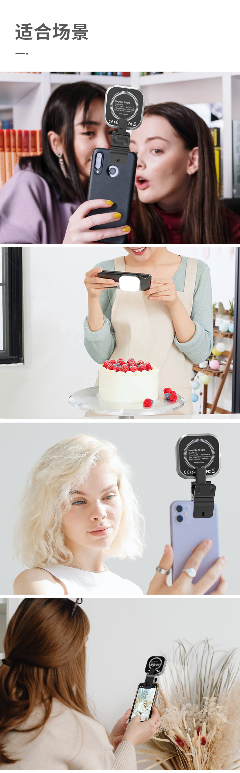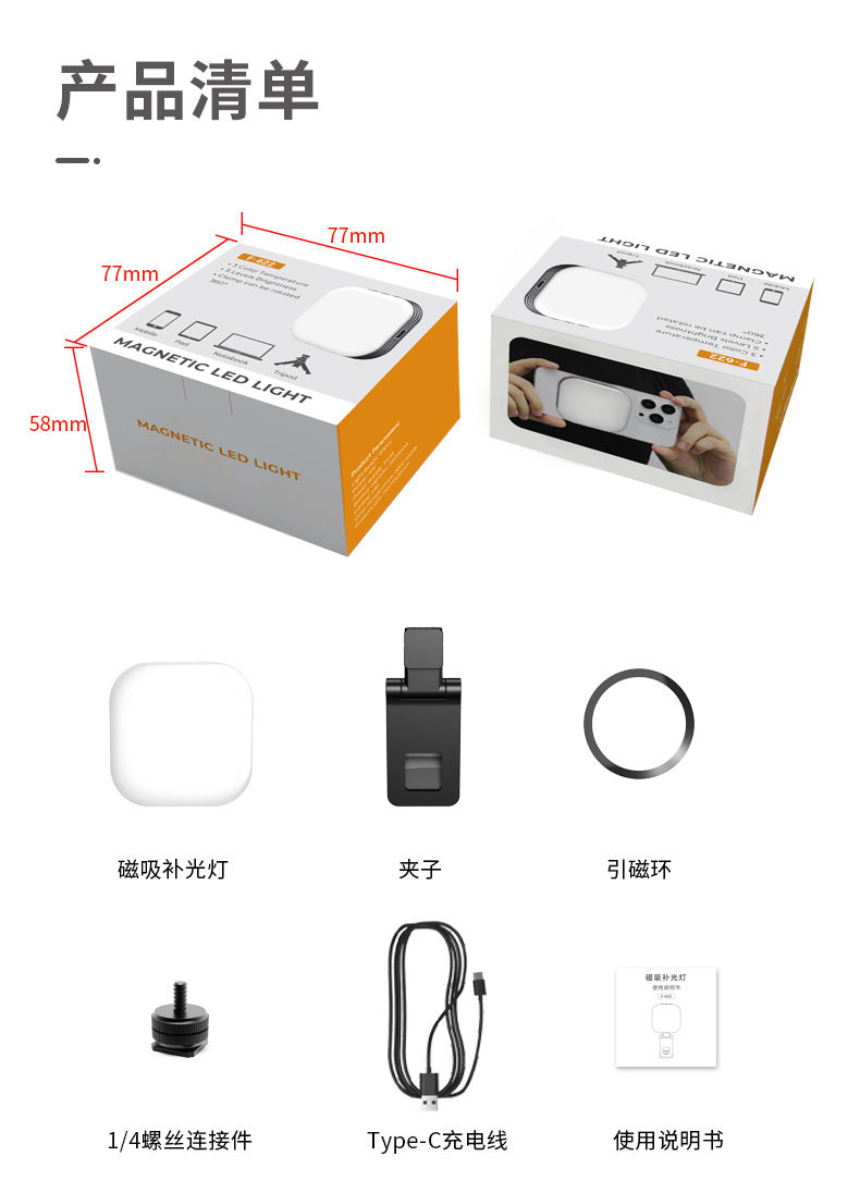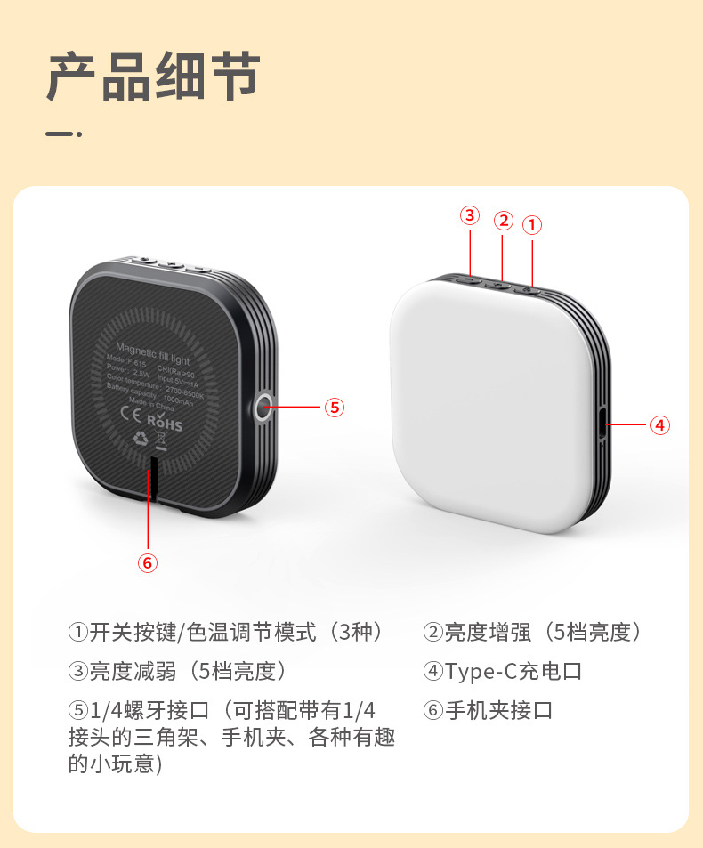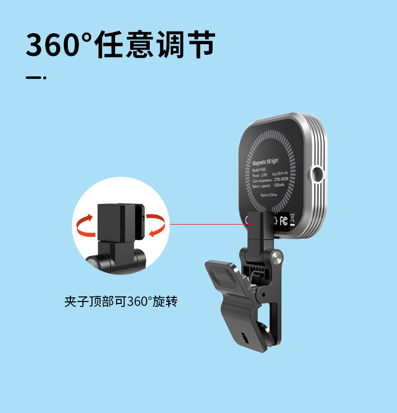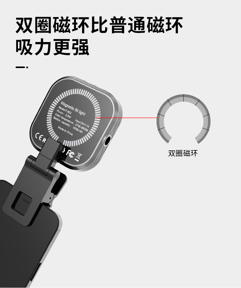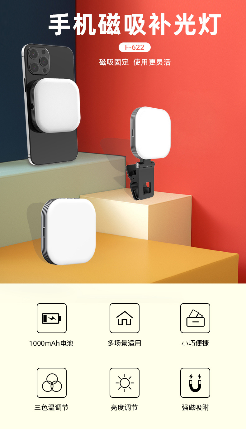 F-622 锋尚私模新品手机磁吸补光灯,1000毫安电池,3色温口袋灯