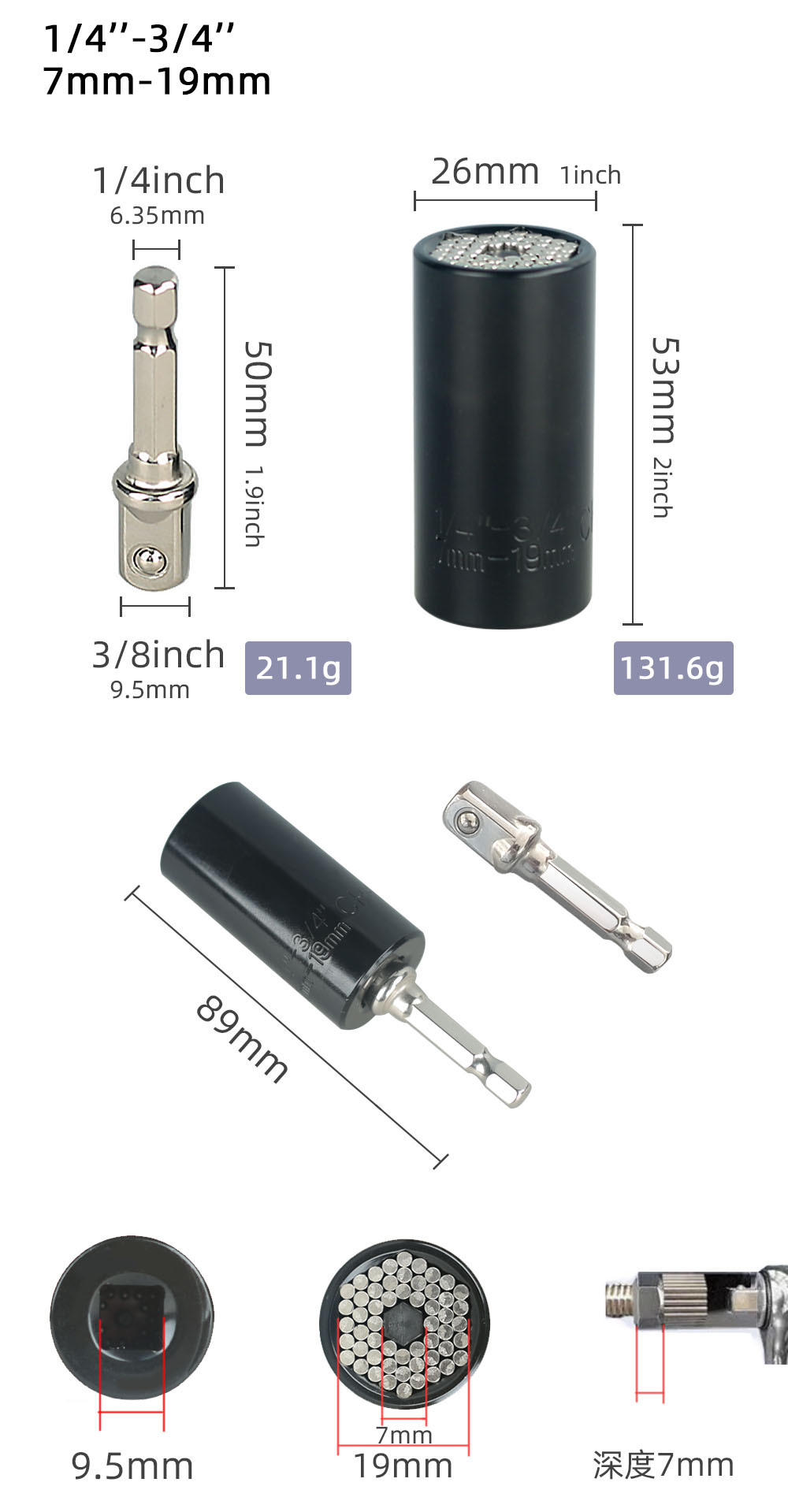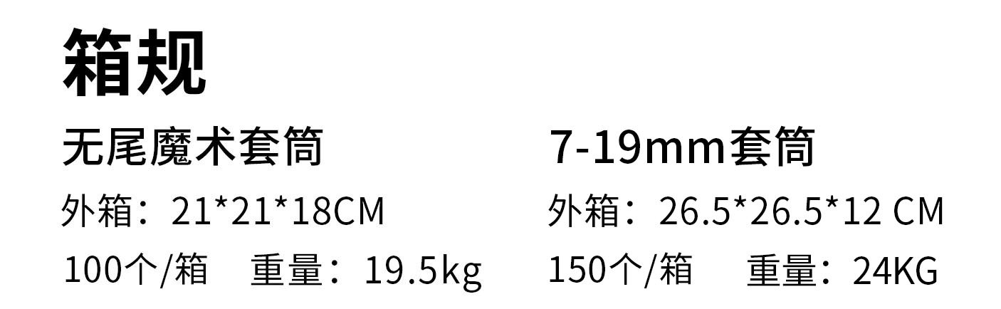 | Especificaciones y modelos | Poste de 3/8" de longitud, bolsa de 50 mm, 21 g.,Llave de trinquete 3/8 204g,Bolsa de funda plateada de 7-19 mm, 138 g.,A1995-7-19MM funda plateada [en caja] 170g,A1996-7-19MM funda plateada [tarjeta] 169g,A1609-(manga plateada + poste) bolsa 158g,Llave de carraca A1984-3/8 + manguito plateado + varilla de extensión [bolsa] 361.2g,Bolsa negra con funda de 7-19 mm, 138 g.,A1248 manga mágica corta [bolsa] 192g,A1249 manga larga mágica [bolsa] 213g,Astilla larga de manga mágica 234g,Stick de color de manga mágica larga 240g,A1236 7-19MM oro manga bolsa 154.3gg,Manga mágica larga + llave de trinquete 416,2g,A1983 - Juego de vasos mágicos largos + llave de trinquete + barra de extensión 437,2 g,A1985 - Juego de vasos mágicos largos + llave de trinquete + barra de extensión de colores 443,2 g |