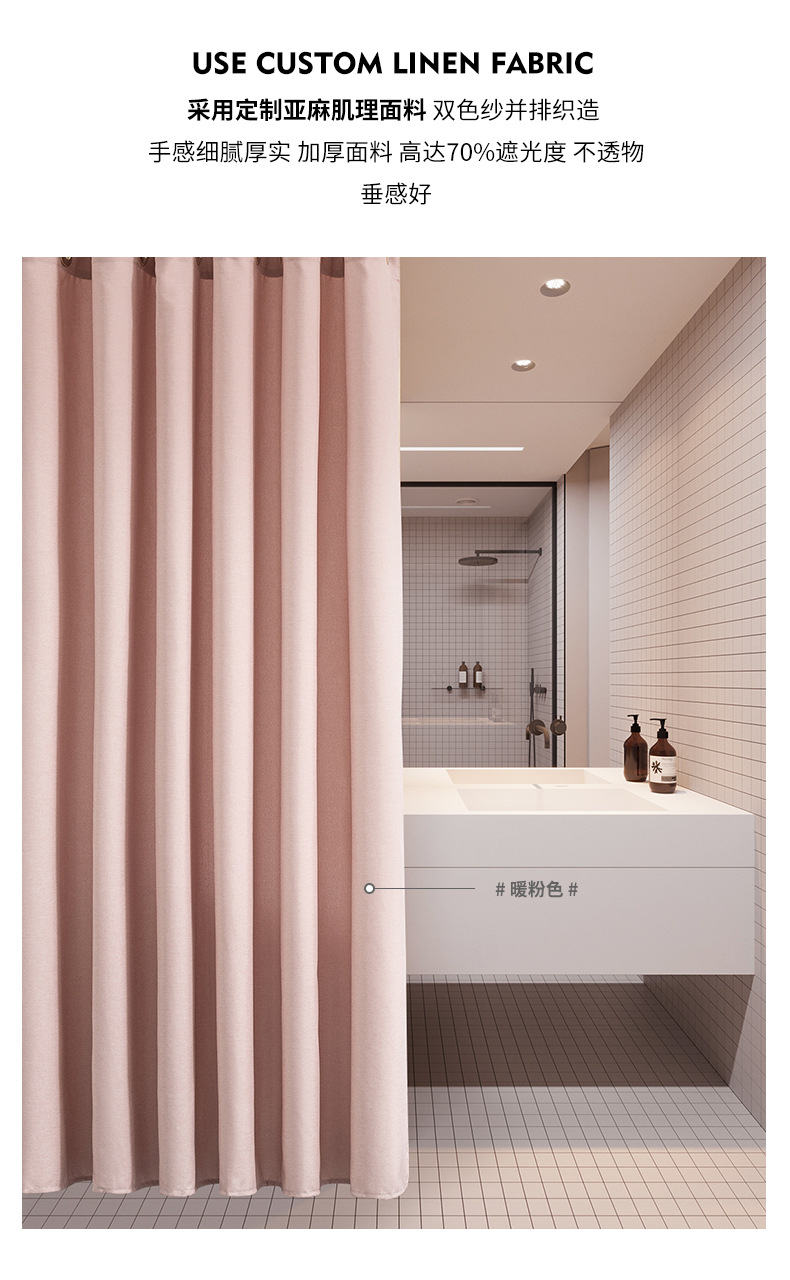 【品名】:北欧仿亚麻浴帘 灰色(面料克重235克每平方米),附12个塑料浴帘环带铜扣眼,铅线。