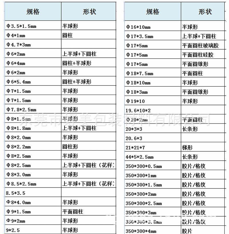 东莞市好美包装材料有限公司产品主营:透明硅胶防撞粒、橡胶、EVA、泡棉、硅胶、海绵、发泡橡胶、PE发泡胶、乳胶、PVC胶、橡胶垫、胶垫、防滑垫、海棉垫、,EVA垫、自粘垫、防震垫、保护垫、家具垫、瓶盖垫片①胶垫产品:EVA胶垫、胶垫圈、橡胶胶垫、透明胶垫、硅胶胶垫、防滑垫、防滑胶垫、防震垫、防震胶垫、橡胶防滑垫、橡胶防震垫、橡胶垫片、橡胶垫圈、硅胶垫圈、硅胶垫、止滑垫、泡棉胶垫、海棉胶垫、绝缘胶垫、发泡胶垫②脚垫产品:橡胶脚垫、透明脚垫、乳胶脚垫、EVA脚垫、泡棉脚垫、硅胶脚垫、自粘脚垫、背胶脚垫。③EVA产品:EVA片材、EVA发泡、EVA垫、EVA胶垫、EVA脚垫、EVA泡棉、EVA海棉、EVA双面胶、EVA不干胶、EVA垫子、EVA垫片、EVA垫圈、EVA工艺品、EVA电子电器配件、EVA绝缘垫片、EVA盒内包装垫、高发泡、回力胶、高弹/防火/防静电EVA等。④泡棉产品:泡棉胶带、EVA泡棉、泡棉双面胶、泡棉胶、泡棉垫、泡棉胶垫、泡棉脚垫,泡棉防震垫、泡棉包装材料。⑤海棉制品:海棉垫、海棉制品、海棉胶、海棉双面胶、EVA海棉、海棉包装盒垫、过滤海棉、波峰海棉等包装材料。⑥绝缘产品:绝缘纸、绝缘垫、绝缘子、绝缘片、快巴纸、青稞纸、PVC绝缘片、PET绝缘片等成型制品。⑦特种产品:调音纸、背胶绒布、防尘网、过滤棉、丝印铭牌、PVC标牌、珍珠棉袋、铝膜珍珠棉袋等。⑧胶粘产品:双面胶、强力双面胶、EVA双面胶、泡棉双面胶、海棉双面胶、墙壁挂钩双面胶、魔力可移胶、可水洗胶,免钉胶、进口3M双面胶等一系列成型胶粘制品。 以上产品均符合ROHS环保标准,可按客户来样或按图生产,可单/双面背胶或模切冲压成型!欢迎来旺/来电咨询!满意服务!