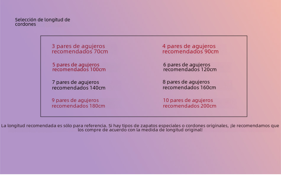 | Longitud | 60cm [ancho 0,8 cm por par],70cm [ancho 0,8 cm por par],80cm [ancho 0,8 cm por par],90cm [ancho 0,8 cm por par],100cm [ancho 0,8 cm por par],120cm [ancho 0,8 cm por par],130cm [ancho 0,8 cm por par],140cm [ancho 0,8 cm por par],150cm [ancho 0,8 cm por par],160cm [ancho 0,8 cm por par],170cm [ancho 0,8 cm por par],180cm [ancho 0,8 cm por par],200cm [ancho 0,8 cm por par] |