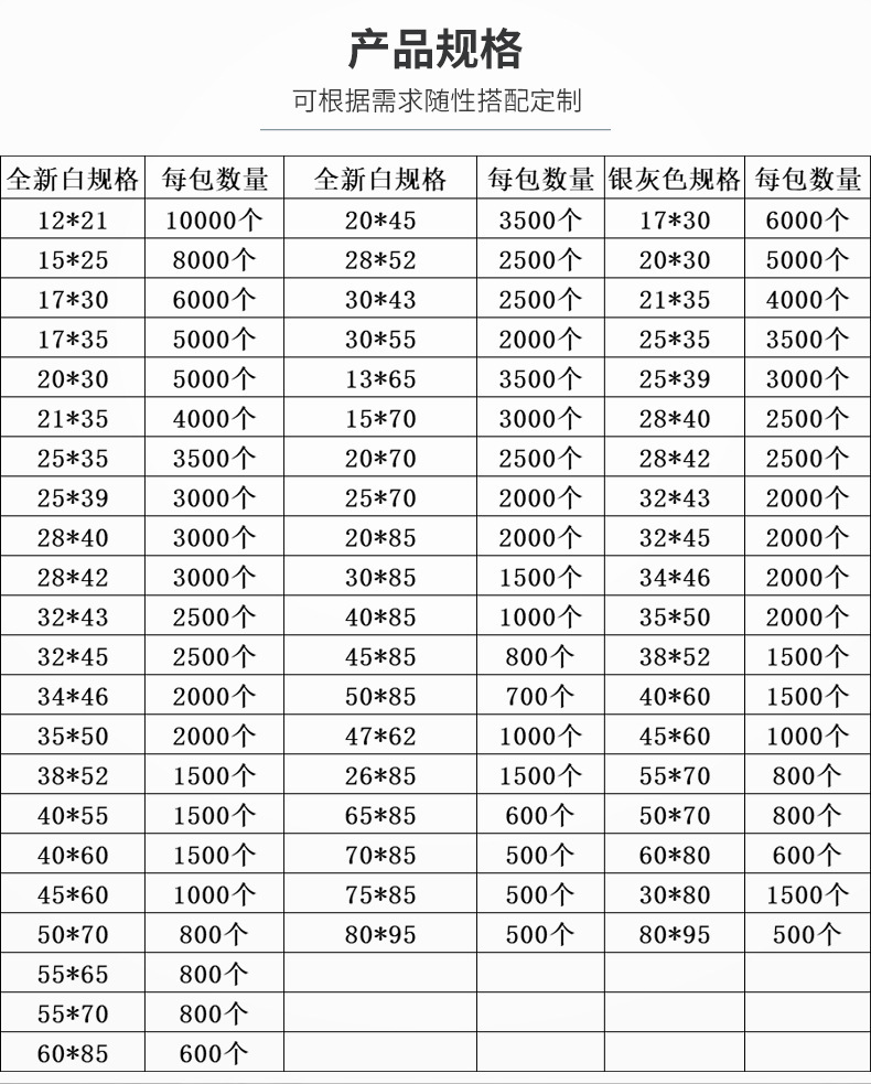 | Modelo de especificación | Blanco; nuevo blanco grueso 12*21,Blanco; blanco nuevo grueso 15*25,Blanco; nuevo blanco grueso 17*30,Blanco; nuevo blanco grueso 17*35,Blanco; blanco nuevo grueso 20*30,Blanco; blanco nuevo engrosado 21*35,Blanco; blanco nuevo engrosado 25*35,Blanco; blanco nuevo engrosado 25*39,Blanco; blanco nuevo engrosado 28*40,Blanco; nuevo blanco grueso 28*42,Blanco; blanco nuevo engrosado 32*43,Blanco; blanco nuevo engrosado 32*45,Blanco; blanco nuevo engrosado 34*46,Blanco; nuevo blanco grueso 35*50,Blanco; blanco nuevo grueso 30*55,Blanco; nuevo blanco grueso 38*52,Blanco; nuevo blanco grueso 40*55,Blanco; nuevo blanco grueso 45*60,Blanco; nuevo blanco grueso 55*65,Blanco; blanco nuevo grueso 50*70,Blanco; nuevo blanco grueso 55*70,Blanco; nuevo blanco grueso 60*85,Blanco; nuevo blanco grueso 75*85,Blanco; blanco nuevo engrosado 25*70,Blanco; blanco nuevo grueso 30*85,Blanco; nuevo blanco grueso 40*85,Blanco; nuevo blanco grueso 80*95,Blanco; nuevo blanco grueso 13*65,Blanco; blanco nuevo grueso 20*70,Blanco; nuevo blanco grueso 40*60,Blanco; blanco nuevo grueso 45*80 |