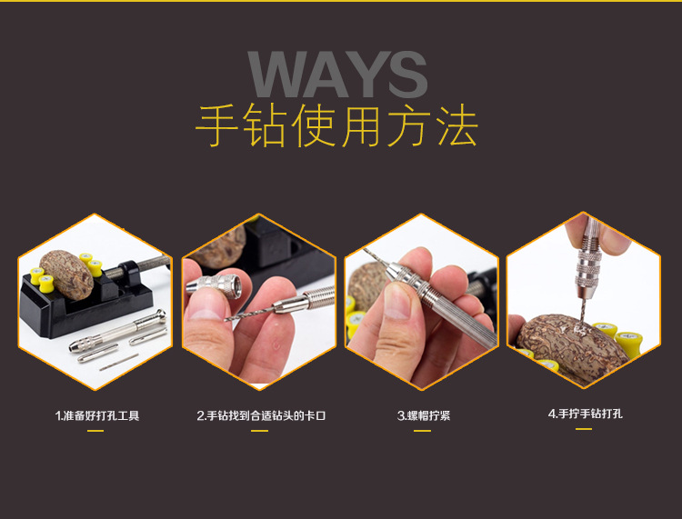 | Modelo de la especificación | Sin broca * Taladro de torsión de mano recta de plata de tamaño pequeño,Con 10 brocas (0,5-2,0mm bolsas) * Tamaño pequeño plata grano recto mano Twist Drill,Con 10 brocas (0,8-3,0mm en caja) * Taladro de mano de grano recto de plata de tamaño pequeño,Con 10 diamantes negros y amarillos (0,8-3,0mm en caja) * Diamantes de giro de mano de grano recto de plata de tamaño pequeño,Equipado con 2 brocas (0,8/1,0mm)* Tamaño pequeño plata grano recto mano Twist Drill,Equipado con 2 brocas (1,0/1,2mm)* Tamaño pequeño plata grano recto mano Twist Drill,[32G en total] con 10 brocas (0,8-3,0mm bolsas) * Taladro giratorio de mano de grano recto de plata de tamaño pequeño,Con 10 brocas (1,0/1,5/2,0/2,5/3,0 cada dos) * tamaño pequeño plata grano recto mano Twist Drill,Sin broca * Medio negro malla mano Twist Taladro,Con 10 brocas (0,5-2,0mm bolsas) * Taladro de mano de malla negra media,Con 10 brocas (0,8-3,0mm en caja) * Medio negro malla mano Twist Taladro,Con 10 diamantes negros y amarillos (0,8-3,0mm en caja) * diamantes de torsión de mano de malla negra media,Equipado con 2 brocas (0,8/1,0) * Medio negro de malla taladro de mano,Equipado con 2 brocas (1,0/1,2mm)* Medio negro malla mano Twist Taladro,[32G en total] brocas con 10 (bolsas de 0,8-3,0mm) * taladro de torsión de mano de malla negra media,Con 10 brocas (1,0/1,5/2,0/2,5/3,0 cada dos) * Medio negro malla mano Twist Taladro,Sin broca * Medio plata malla mano Twist Drill,Con 10 brocas (0,5-2,0mm bolsas) * taladro de mano de malla de plata media,Con 10 brocas (0,8-3,0mm en caja) * taladro de torsión de mano de malla de plata media,Con 10 diamantes negros y amarillos (0,8-3,0mm en caja) * diamantes de torsión de mano de malla de plata media,Equipado con 2 brocas (0,8/1,0mm)* Medio de malla de plata taladro de mano,Equipado con 2 brocas (1,0/1,2mm)* Medium Silver Mesh mano Twist Drill,[32G en total] brocas con 10 (bolsas de 0,8-3,0mm) * taladro de torsión de mano de malla de plata media,Con 10 brocas (1,0/1,5/2,0/2,5/3,0 cada dos) * Medio de malla de plata taladro de mano |