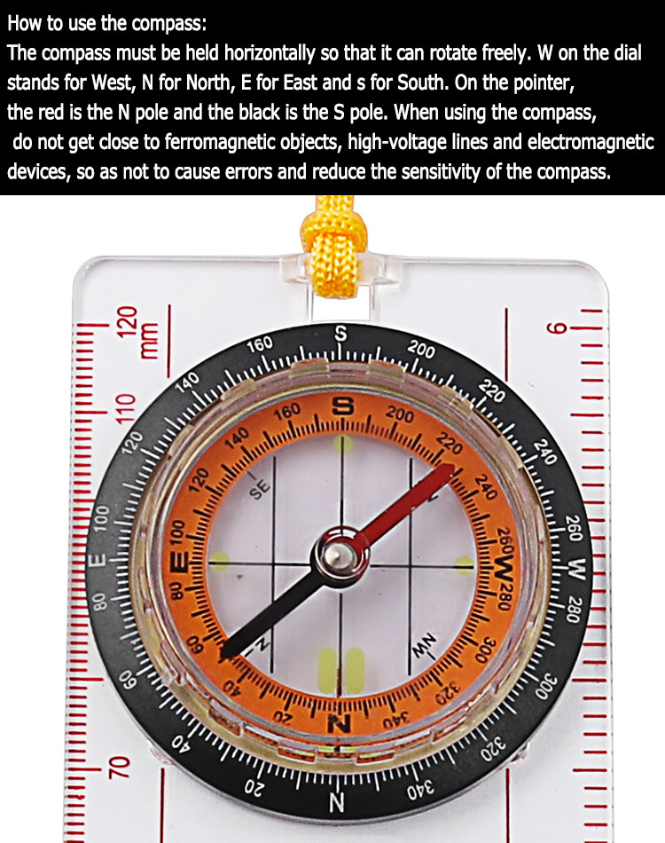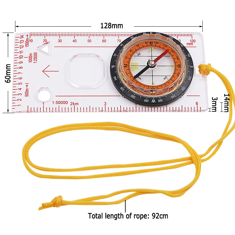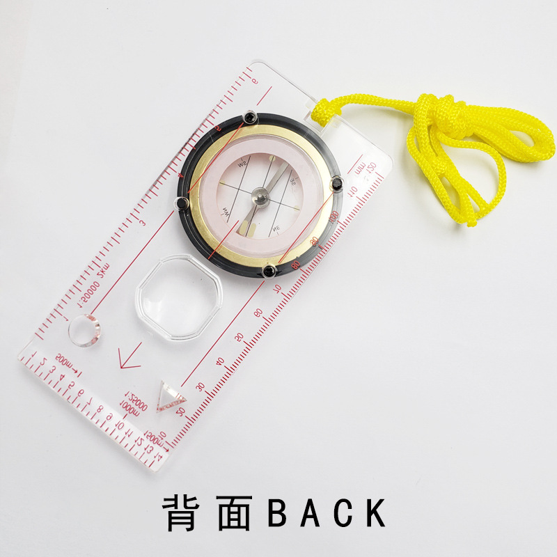 比例尺指南针:自带刻度尺,可测量地图比例算距离,另外还配有挂绳,携带小巧方便,适用户外旅游求生探险辨别方向!