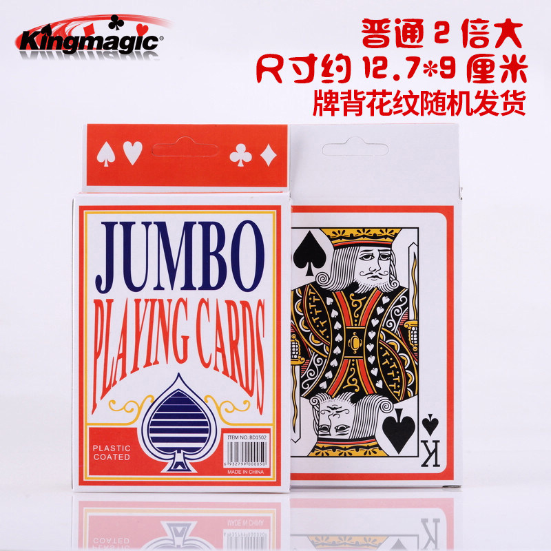 五倍扑克:普通扑克的四倍尺寸约19.5*13cm重量约308克(80副一箱,外箱尺寸43.5*40*27.5cm)