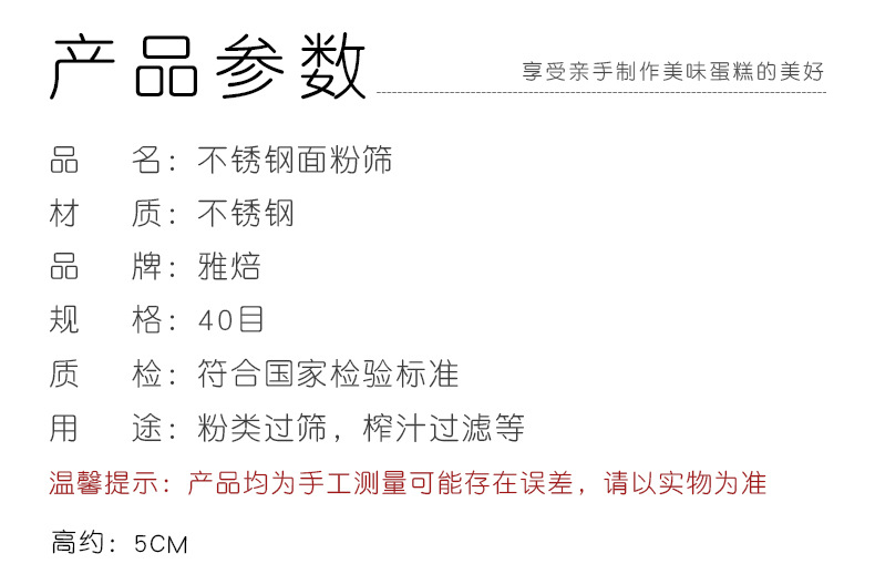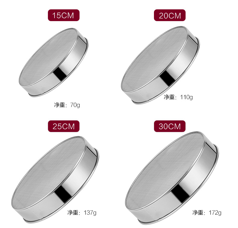 | Especificaciones | Tamiz de harina de acero inoxidable de malla 40 15CM(042040),Tamiz de harina de acero inoxidable de malla 40 20CM(042041),Tamiz de harina de acero inoxidable de malla 40 25CM(042042),Tamiz de harina de acero inoxidable de malla 40 30CM(042043) |
