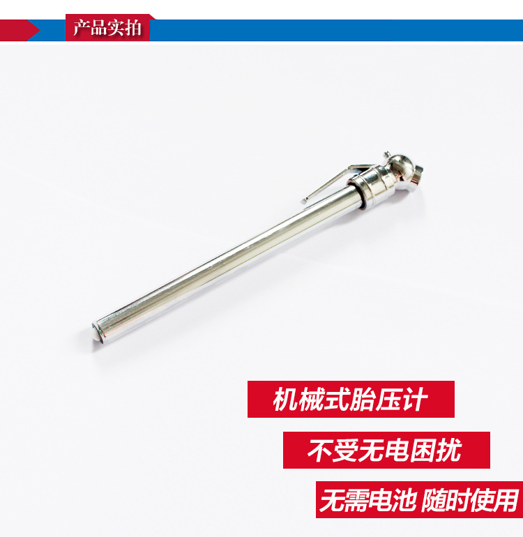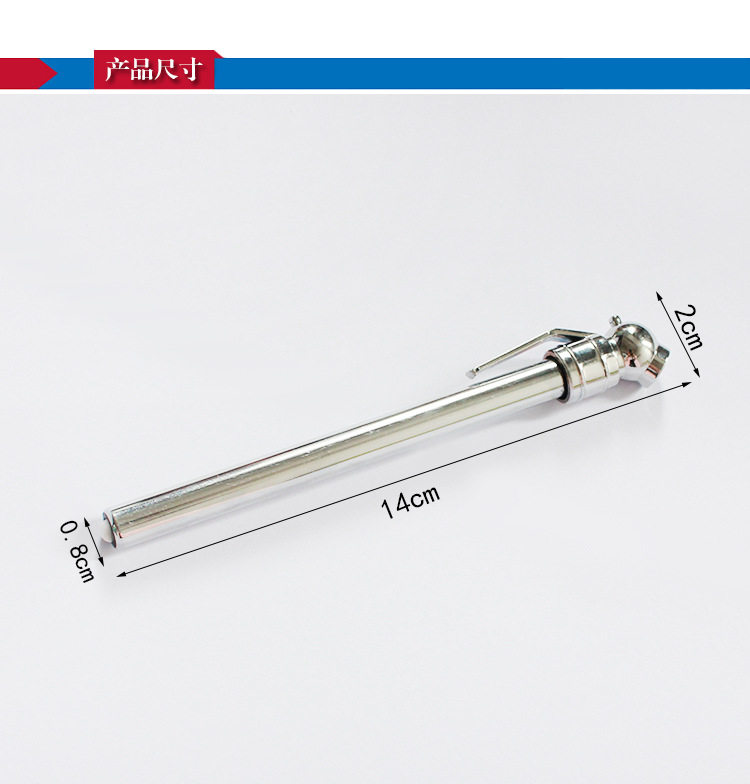 【名称】汽车胎压器 【材质】铝合金杆 【规格】直径1厘米 ,长14.5厘米 【测量范围】5-50 PSI , 0.5-3.5KG, 50-350kpa 【描述】体积极小,可作为笔扣在衣服口袋上,携带非常方便。使用方便,压入气嘴即可测量汽车轮胎胎压,随时掌握轮胎安全,简单实用。 单位换算说明: 1KG(公斤)=14.5PSI(压力) 1KG(公斤)=100KPA(压强