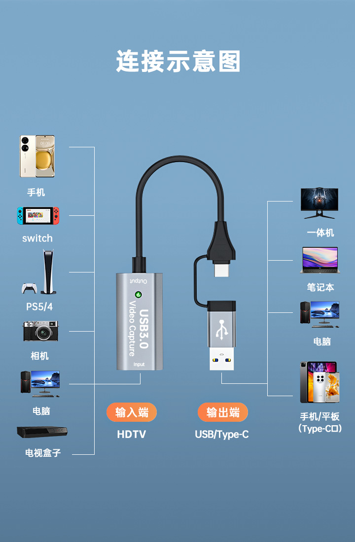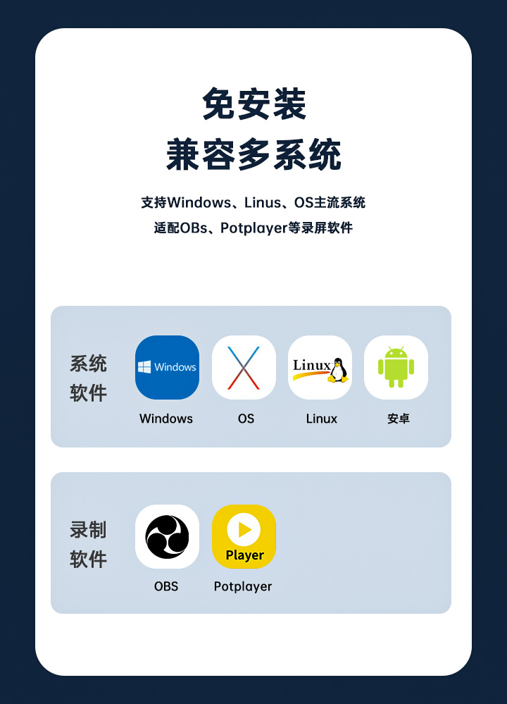 3.兼容多系统:采集卡适用于Windows、Mac OS、Android、Linux等。USB3.0高速传输端口,实时反馈,实时串流到Twitch、youtube、OBS Amcap, Potplayer 和 VLC 更容易。