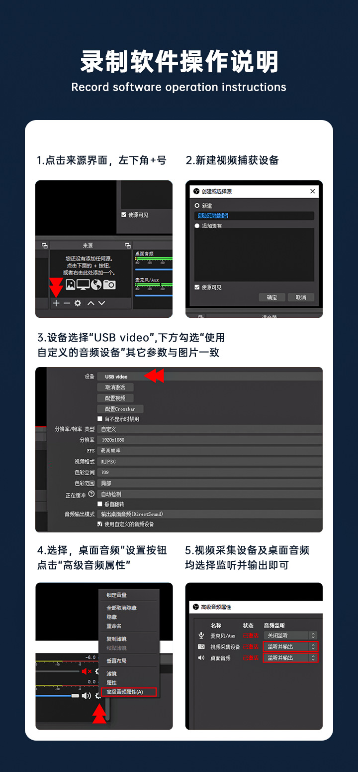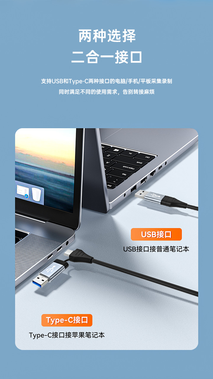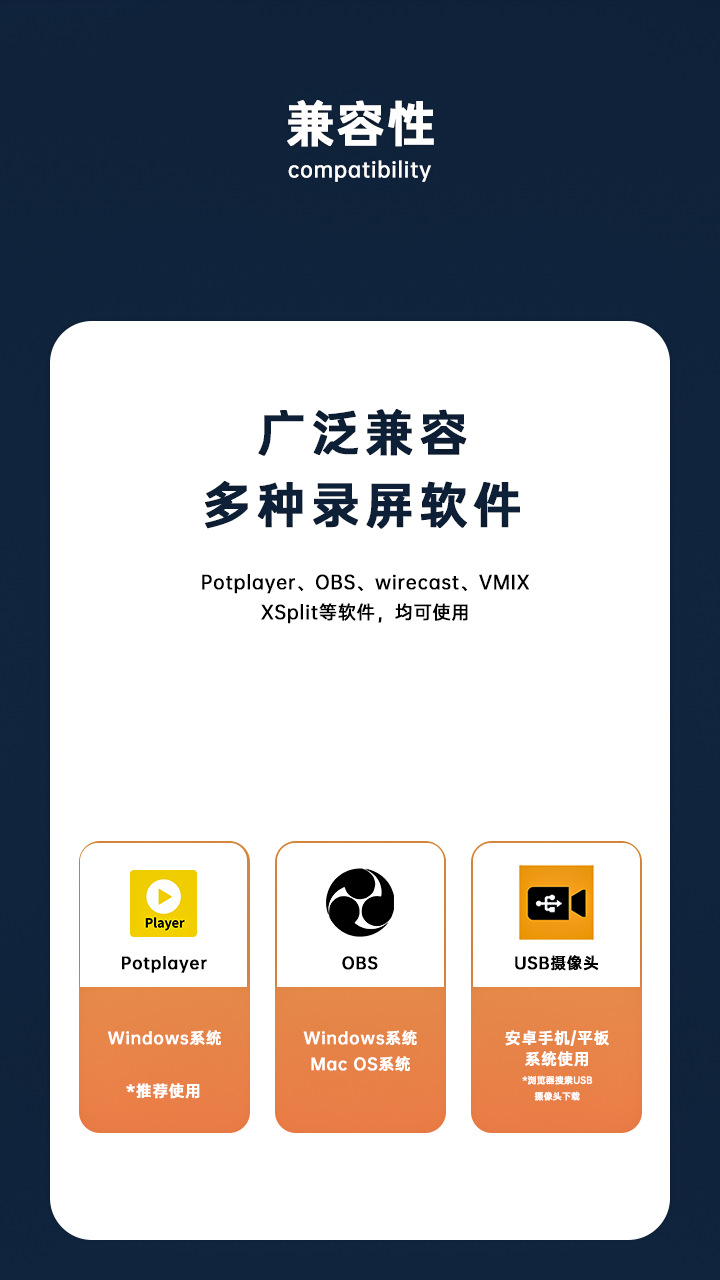 HDTV 兼容标准线缆:输入15米 支持大多数采集软件,如VLC/OBS/Amcap等 支持Windows/Android/MacOS 符合USB Video和UVC标准 符合USB Audio UAC标准