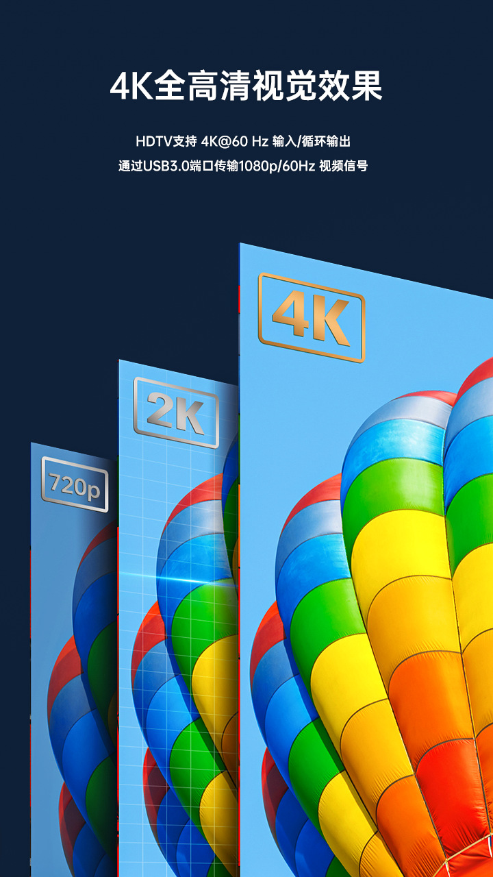 1. HDTV Compatible——兼容4K采集设备:高清采集设备专为设计而设计,不需要外接电源。视频采集卡使实时流媒体和录制变得轻松快捷。非常适合游戏、流媒体、直播、会议、教育、视频 Blogger 录制等。随时随地捕捉。