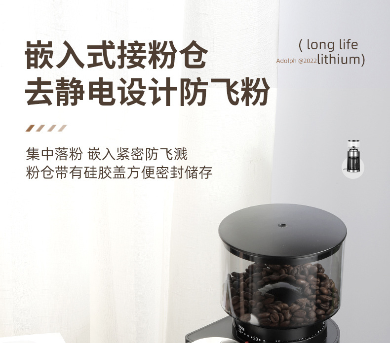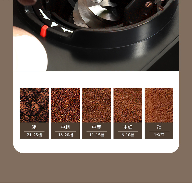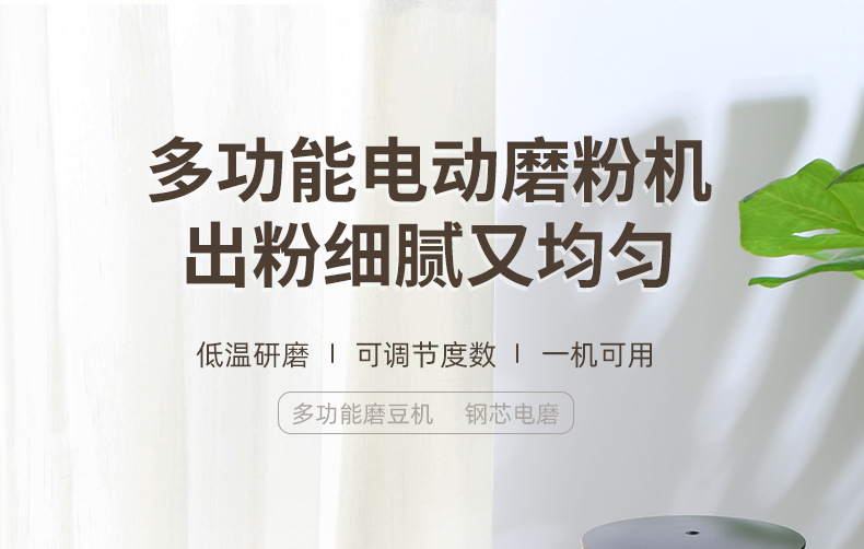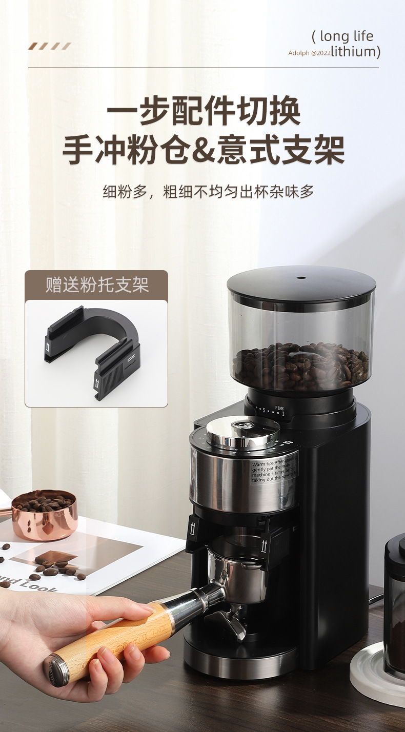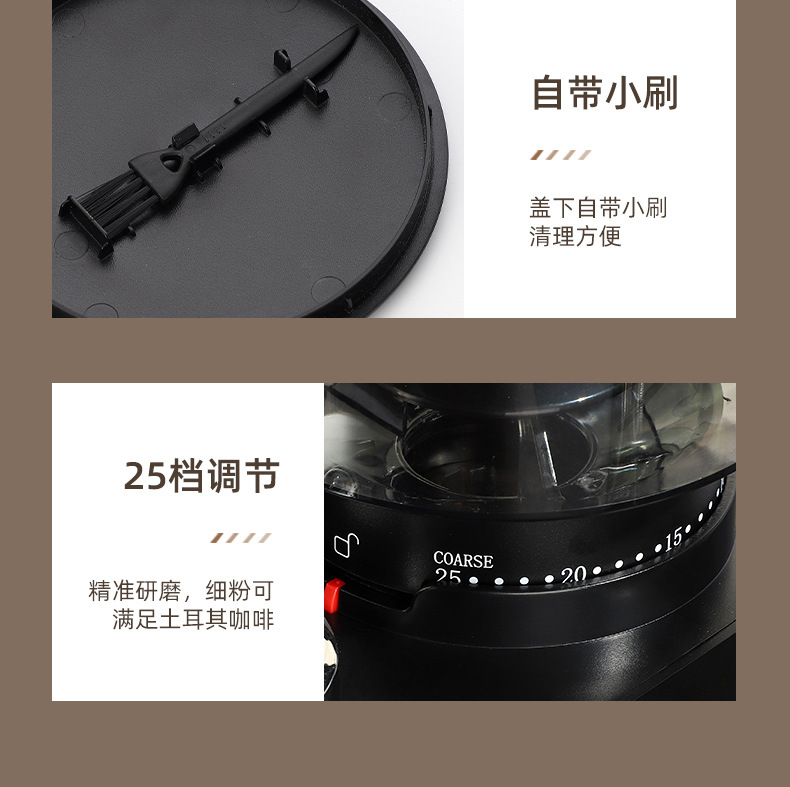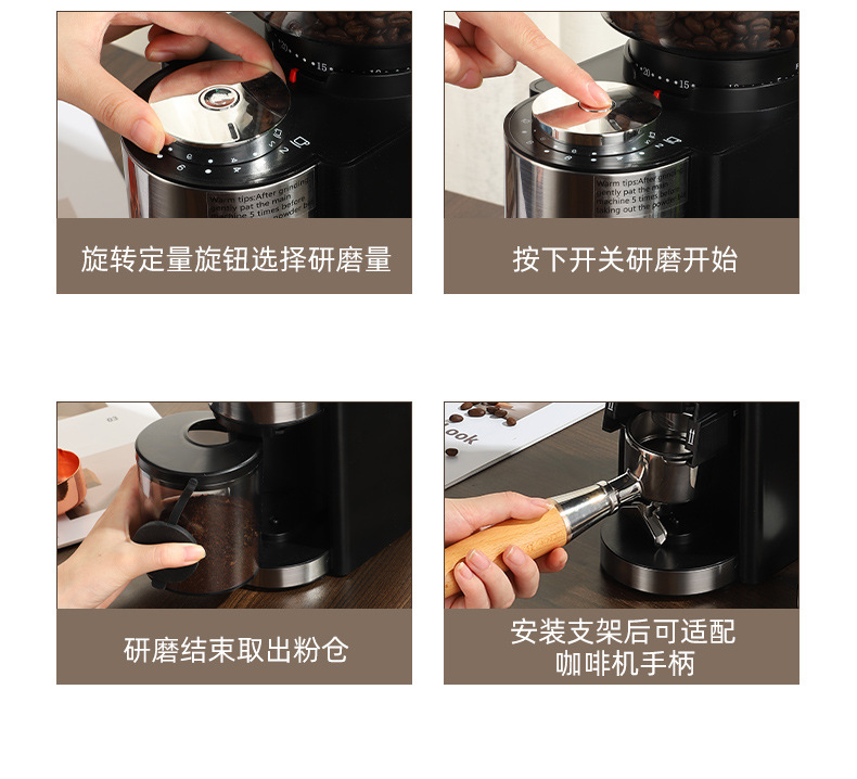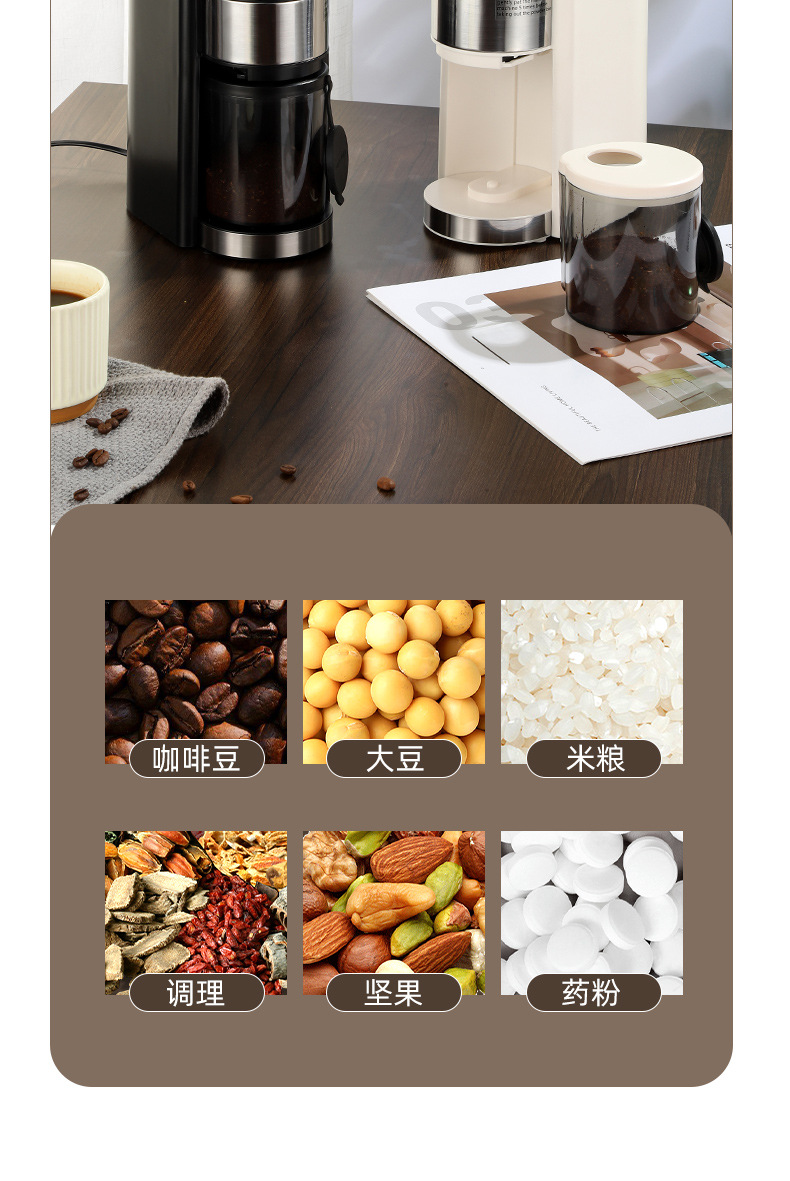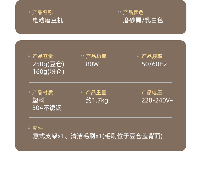 产品配套: 研磨器X1 ,粉托支架X1(直接卡在出粉口下面),毛刷X1(在豆仓盖子下面),密封罐X1 ,接粉环X1