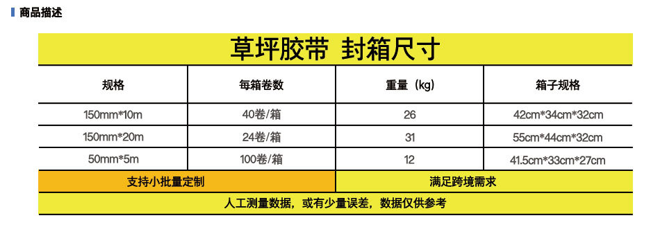 | Modelo de especificación | 50mm * 5m * verde oscuro,100mm * 10m * verde oscuro,100mm * 20m * verde oscuro,150mm * 5m * verde oscuro,150mm * 10m * verde oscuro,150mm * 20m * verde oscuro |