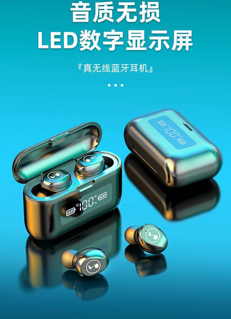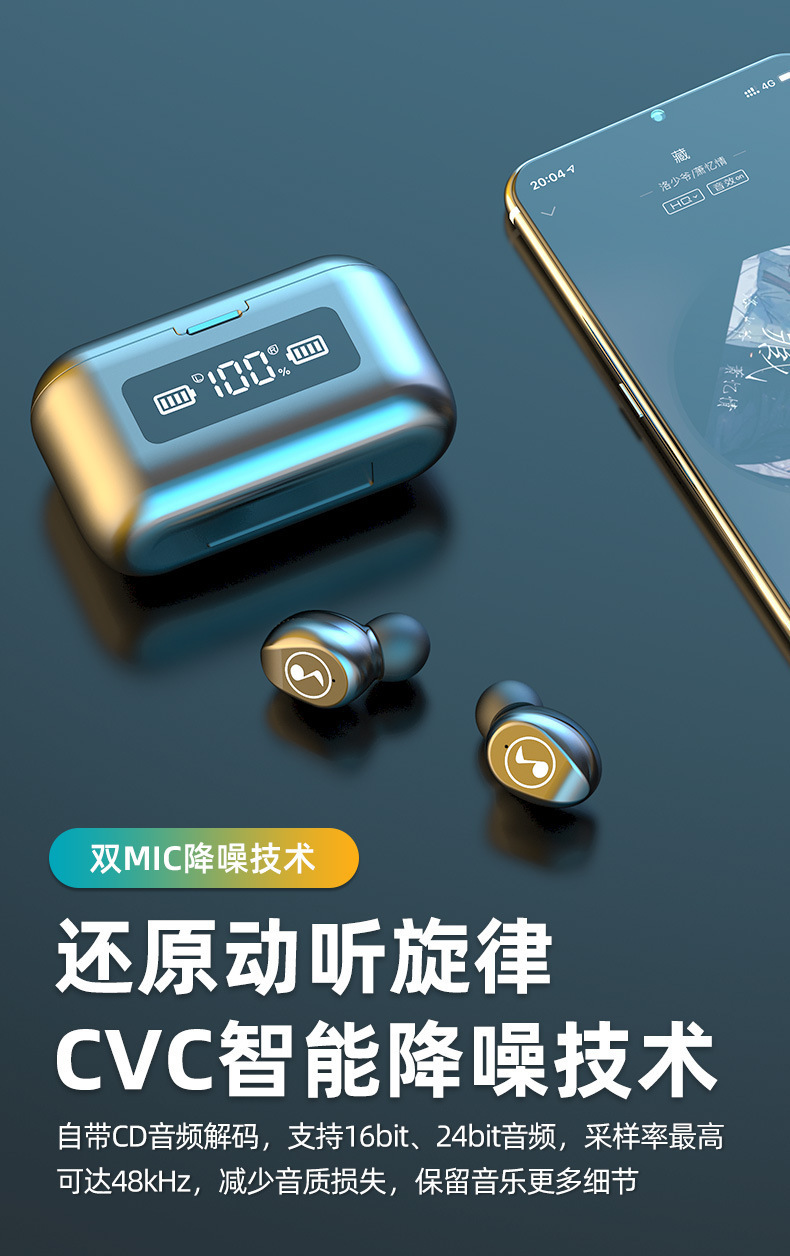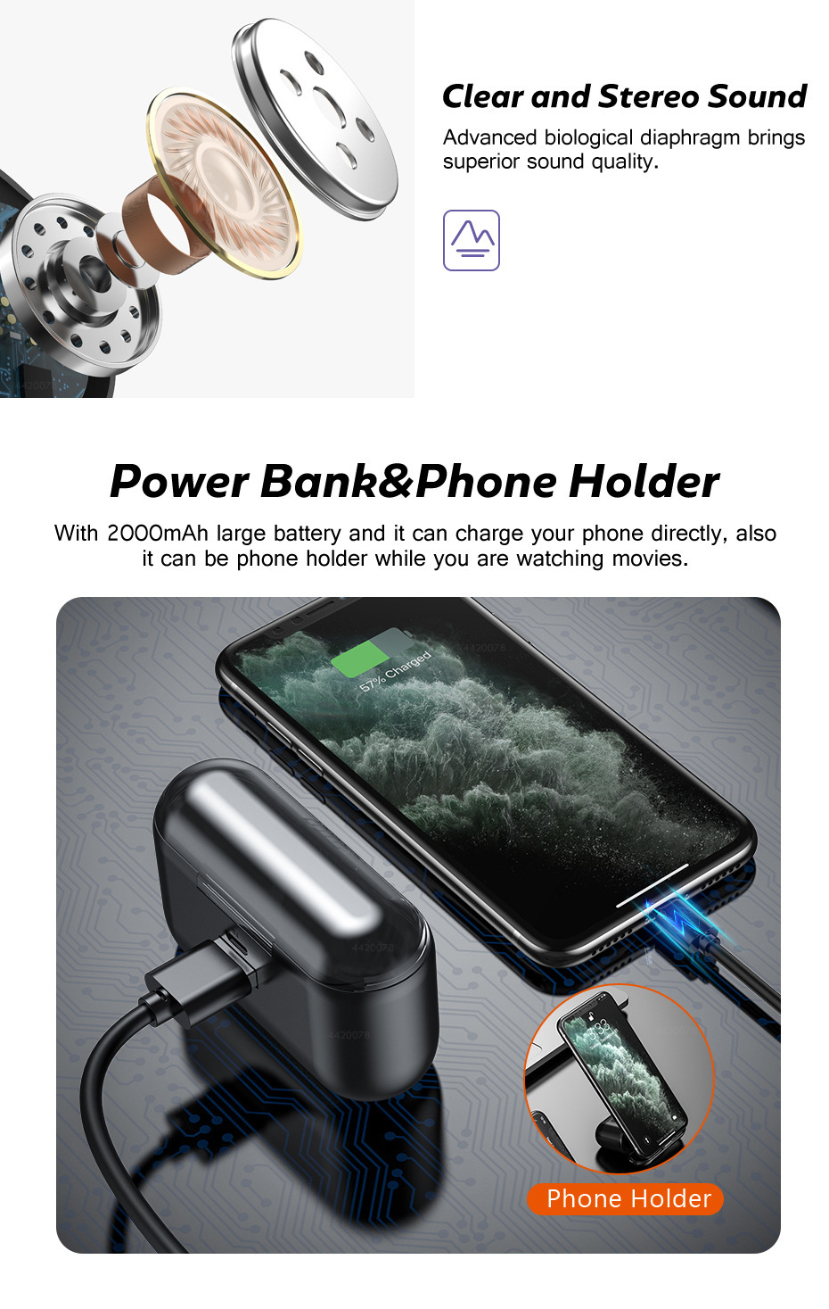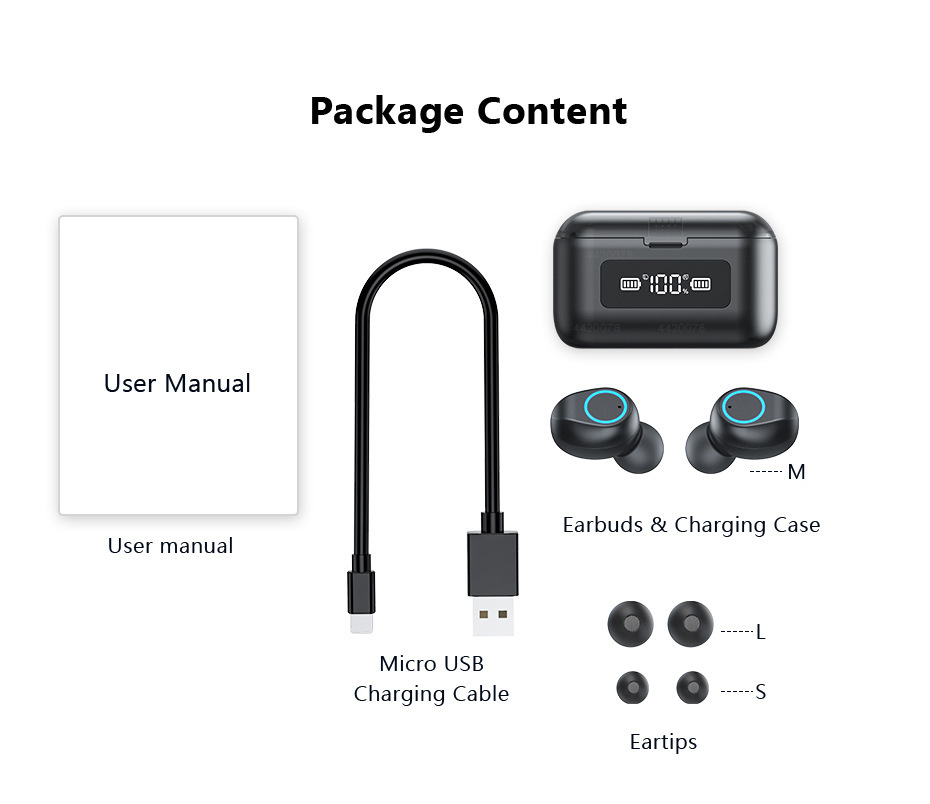 2*蓝牙耳机,1*电池仓,1*USB线,1*说明书,4*耳塞