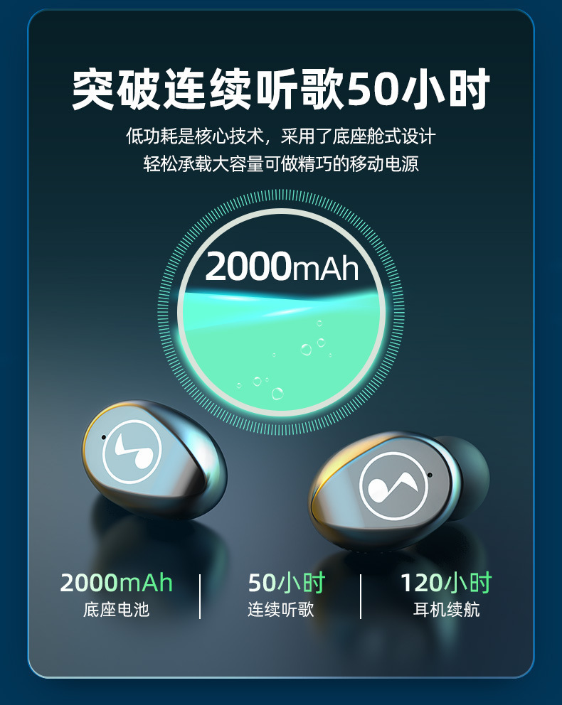 电池容量:耳机50mAH,充电仓:1200mAH(英文版本说明书和盒子不写电池容量)