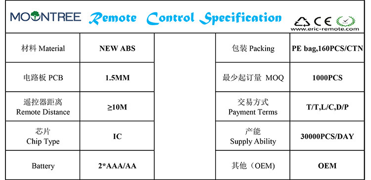 遥控器功能、外型、颜色可跟据客户要求定制,也可按照客户样品或设图设计开模生产。