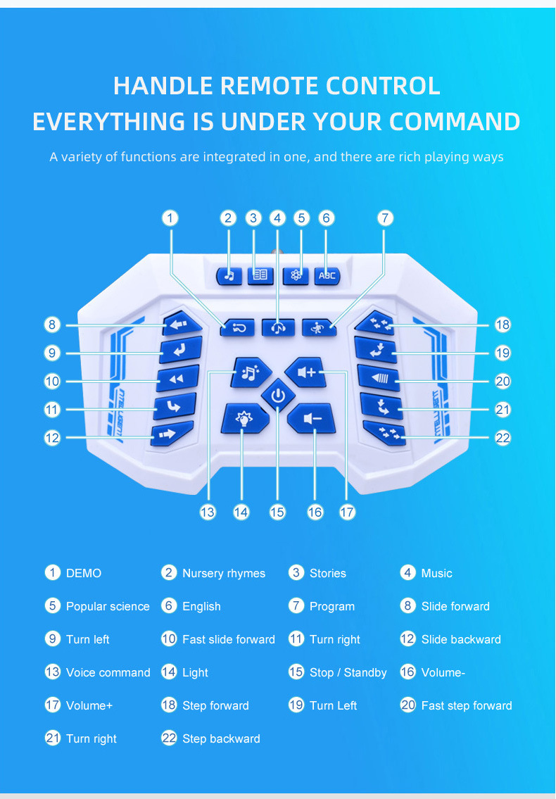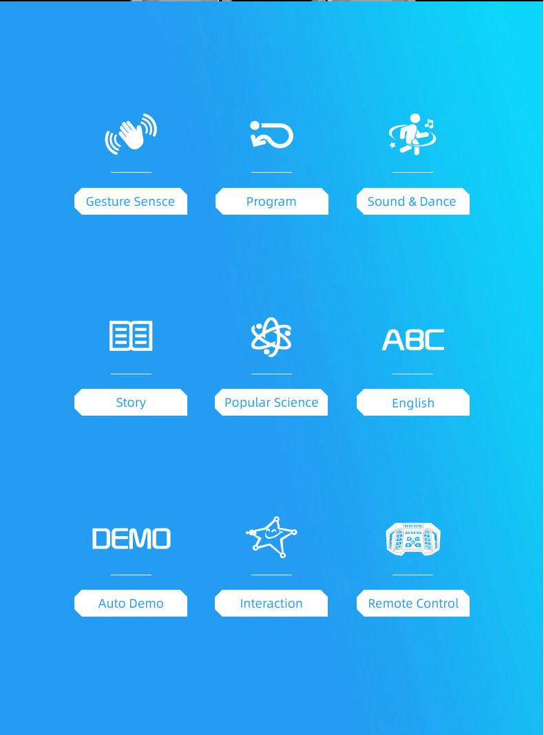 产品功能: 智能自动演示 智能编程 左转,右转,滑行前进/快进/后退,跨步前进/快进/后退 LED灯光