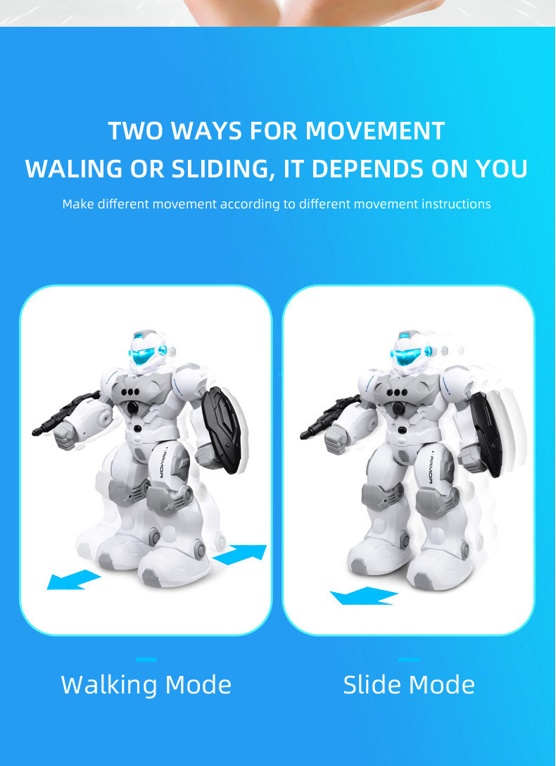 产品介绍: 1528是一款具有前进后退灯光音乐唱跳等21种功能的智能战警机器人,拥有红外线遥控和手势感应控制两种模式。手势感应功能可根据你的手势完成各个动作并搭配音效,动感十足。可支持编程,孩子可自由编辑遥控按键,控制机器人展示相应的动作。机器人包含2篇小故事、4个科普小知识、5段日常问候语、13首音乐,可以让孩子在玩耍的过程获得知识,激发学习兴趣。机器人有中文和英文两款语言系统,适合国内外销售。