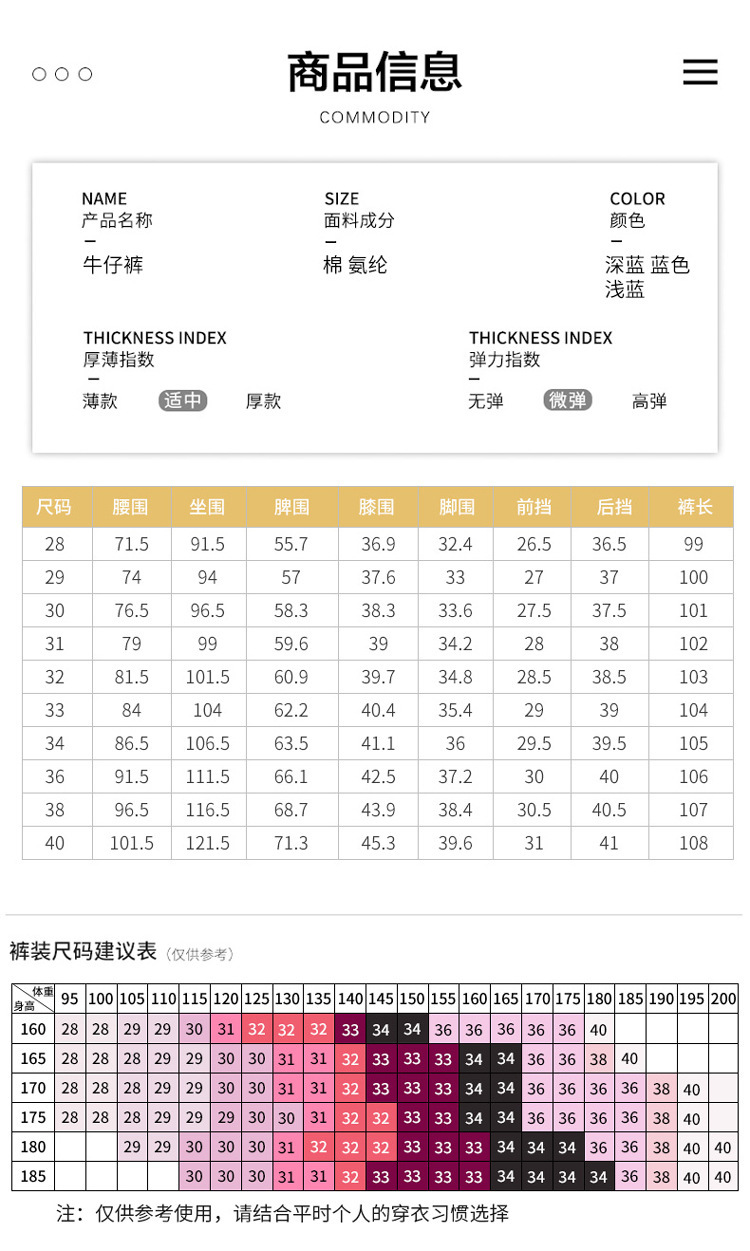 | Talla | 28,29,30,31,32,33,34,36,38,40 |