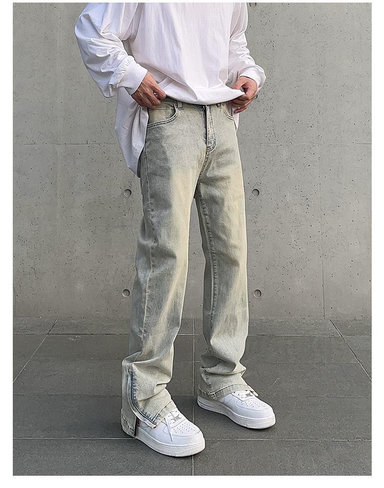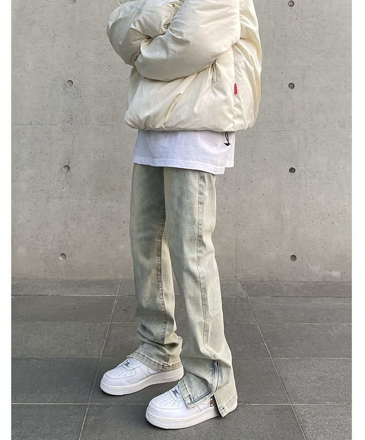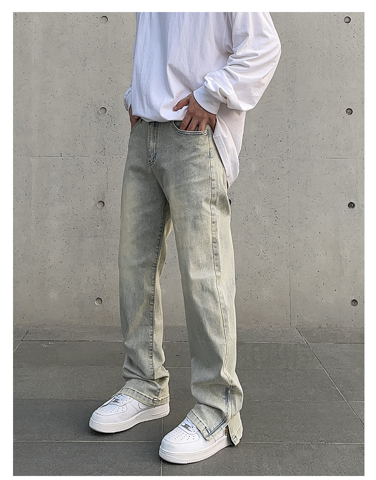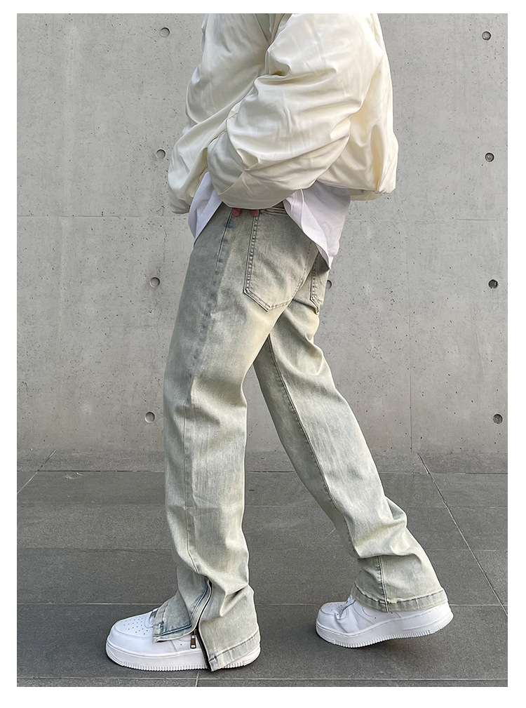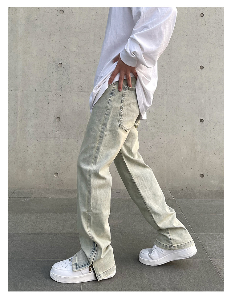 American High Street Vibe vintage lavado apenado amarillo barro teñido cremallera split jeans hombres pantalones largos rectos