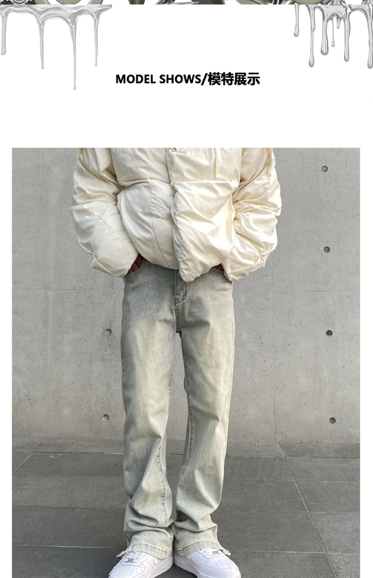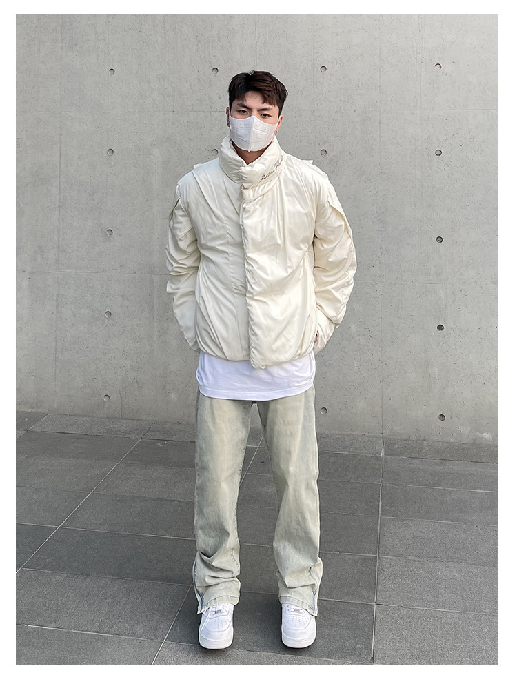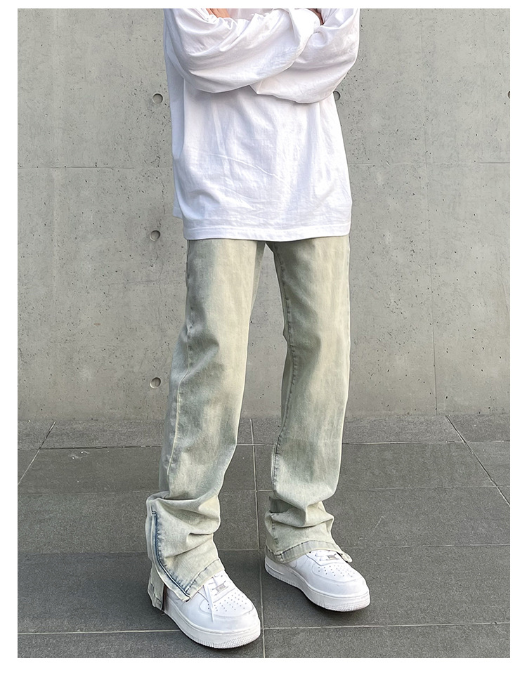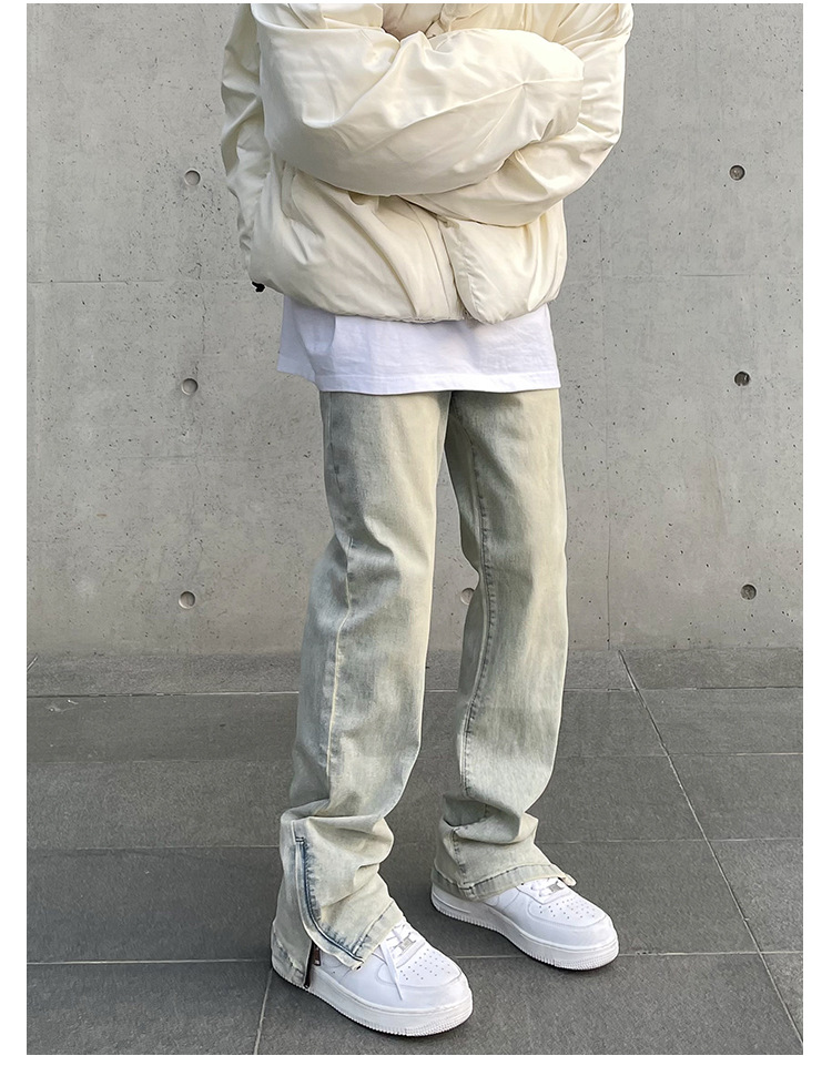 American High Street Vibe vintage lavado apenado amarillo barro teñido cremallera split jeans hombres pantalones largos rectos