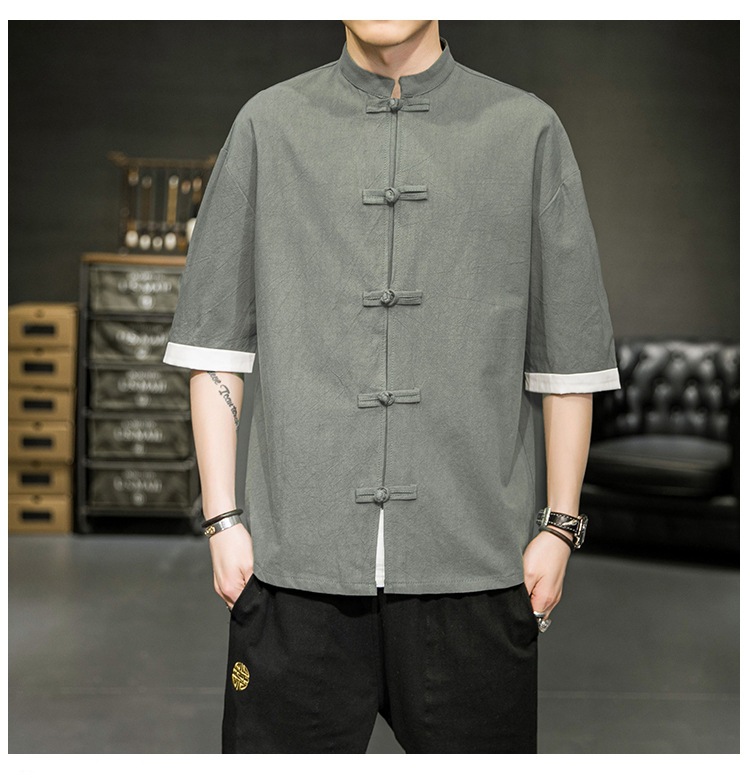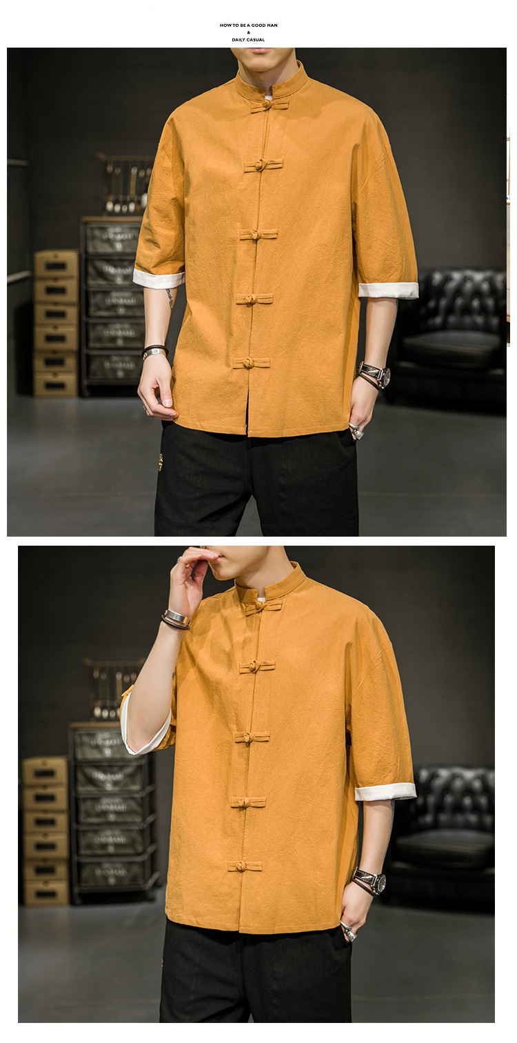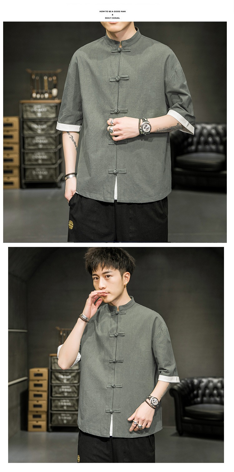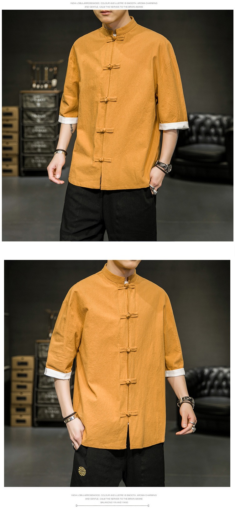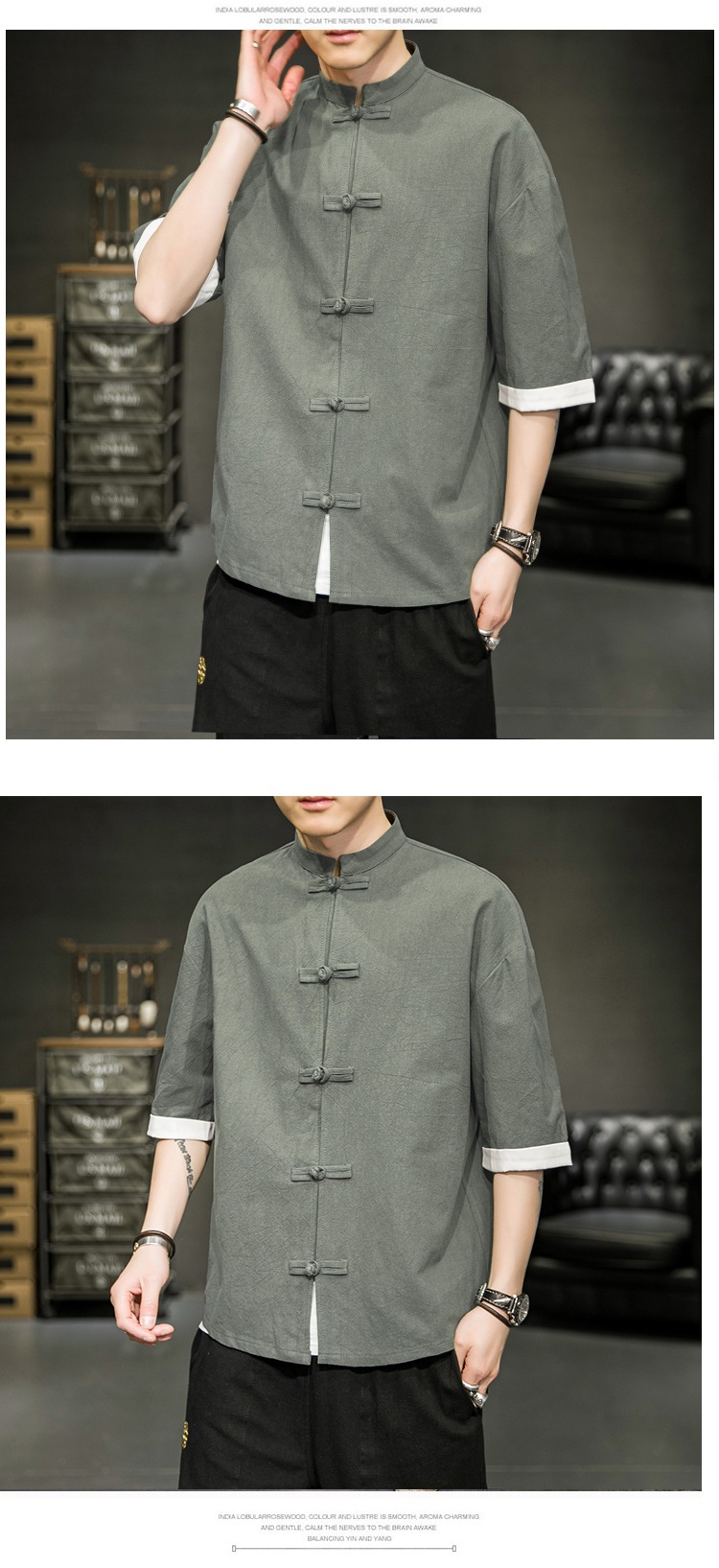 Lino de manga corta Camisa de los hombres de estilo chino hebilla Tang traje de manga cinco cuartos ropa estilo retro juventud estilo chino abrigo de moda
