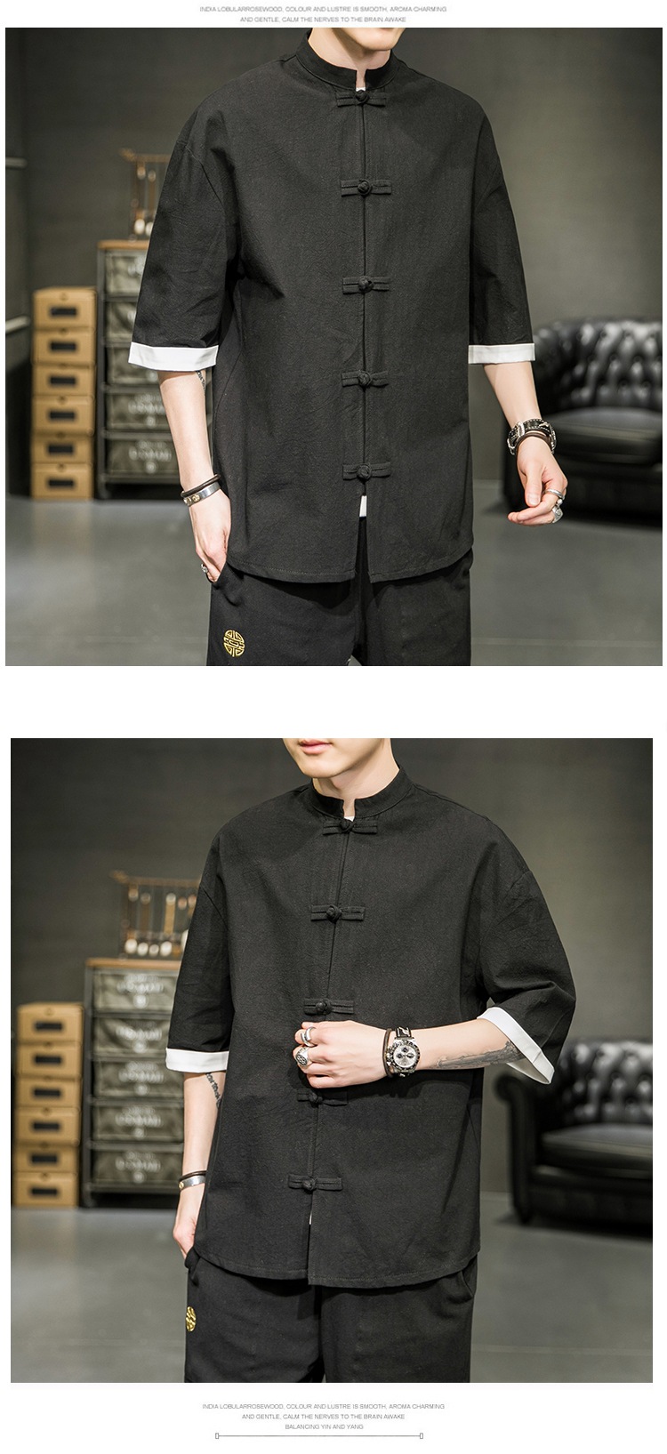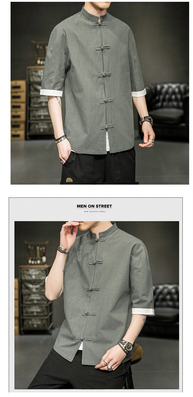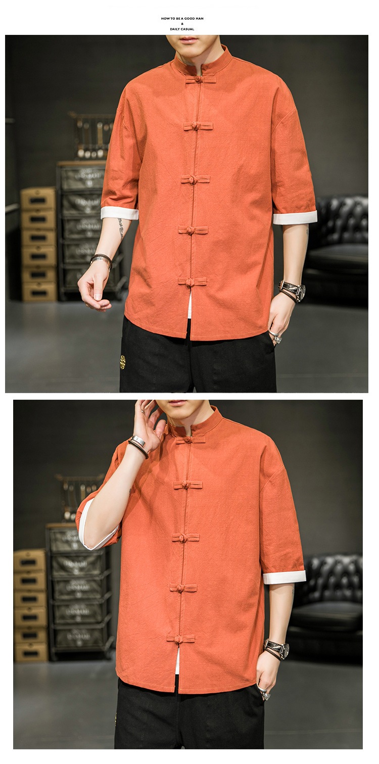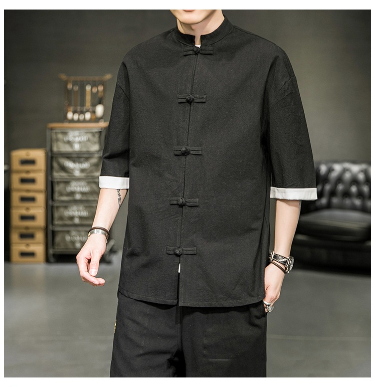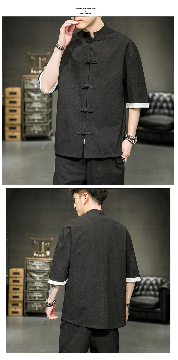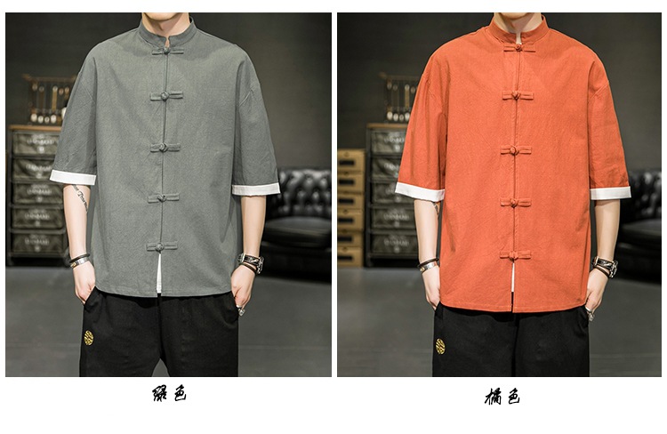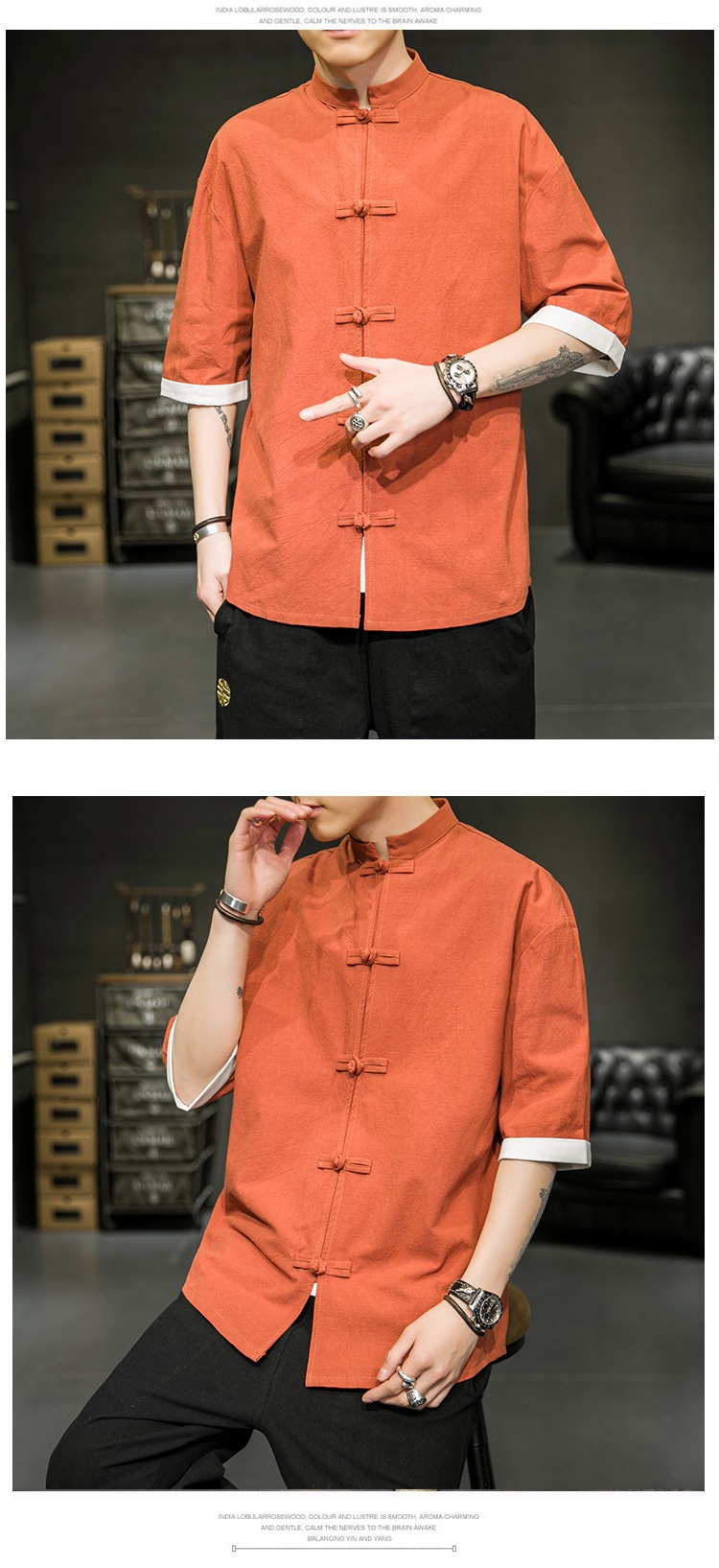 Lino de manga corta Camisa de los hombres de estilo chino hebilla Tang traje de manga cinco cuartos ropa estilo retro juventud estilo chino abrigo de moda