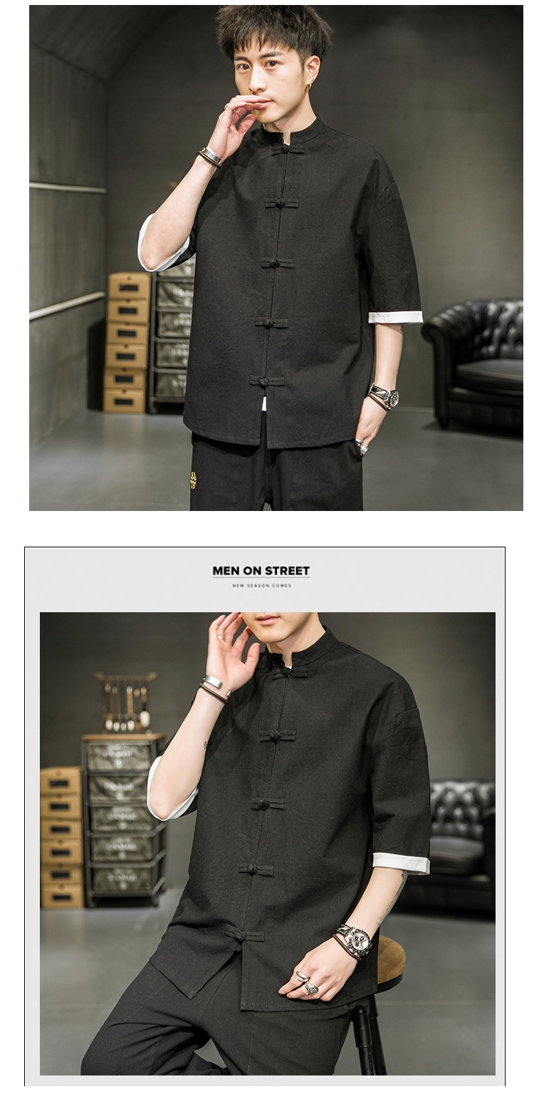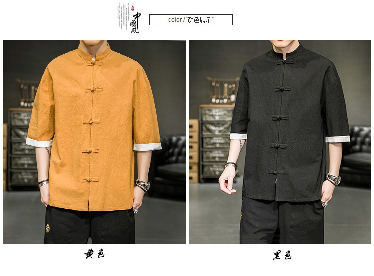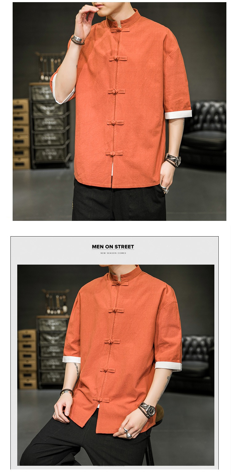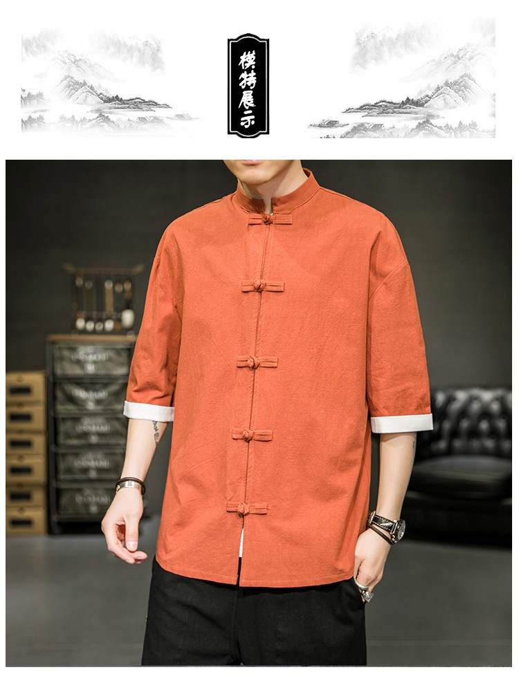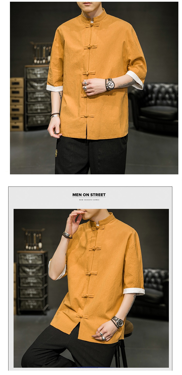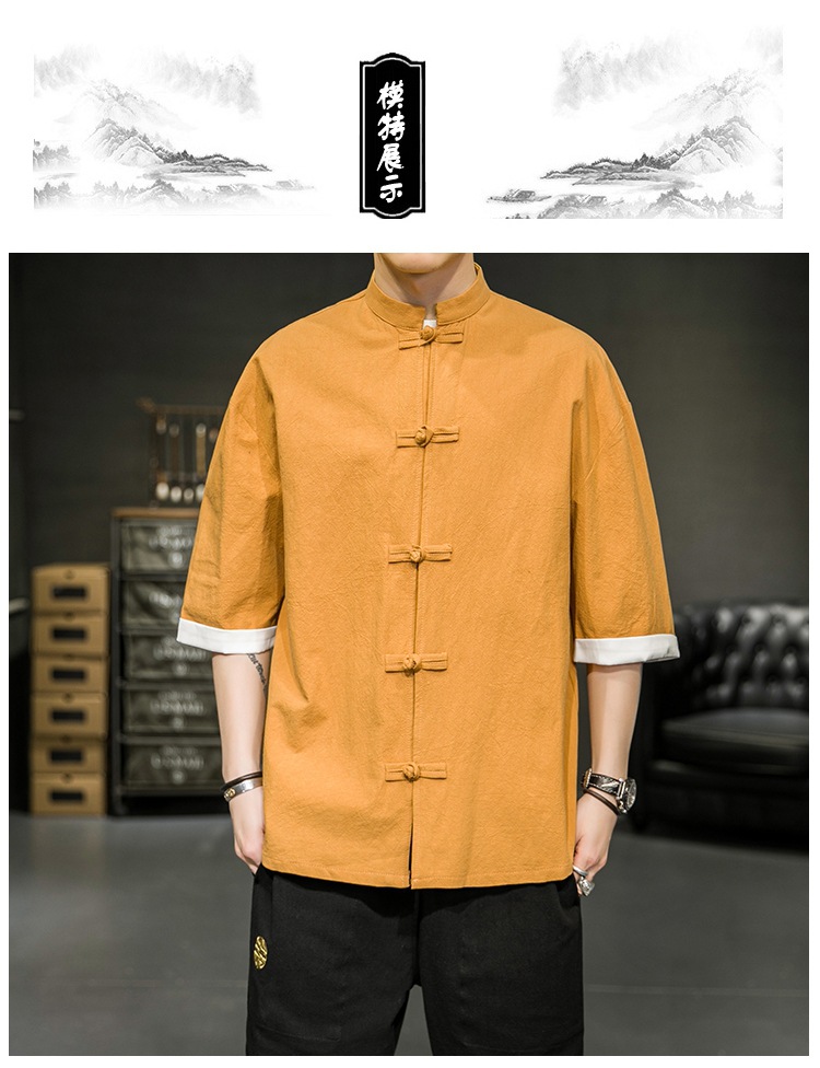 Lino de manga corta Camisa de los hombres de estilo chino hebilla Tang traje de manga cinco cuartos ropa estilo retro juventud estilo chino abrigo de moda
