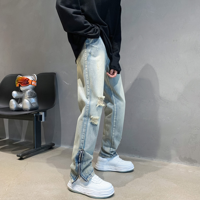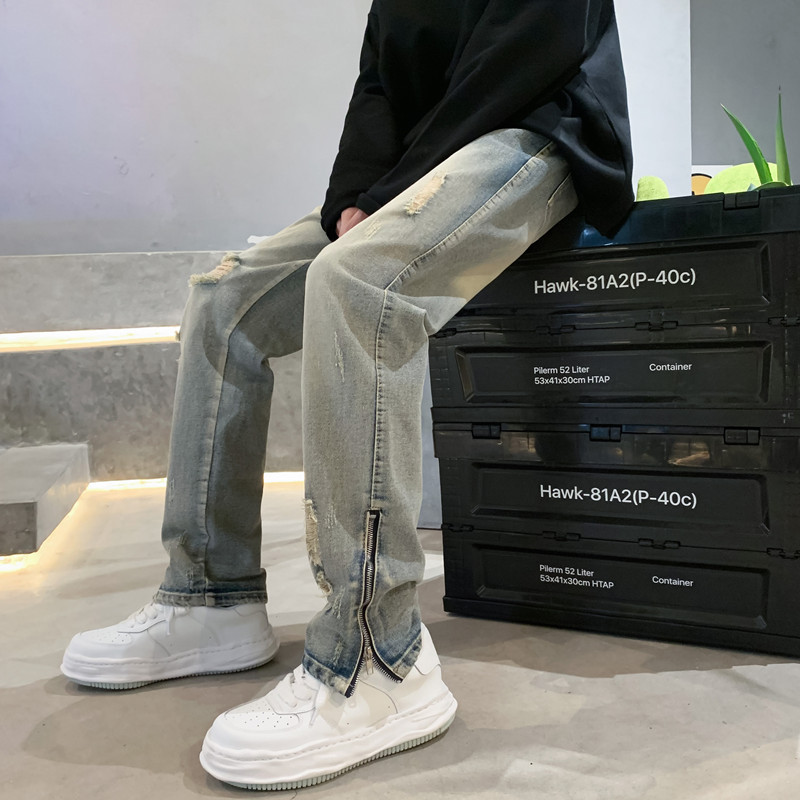 Ripped jeans hombres nicho de diseño sentido europeo y americano High Street Vibe moda marca americana verano ins cremallera Pantalones