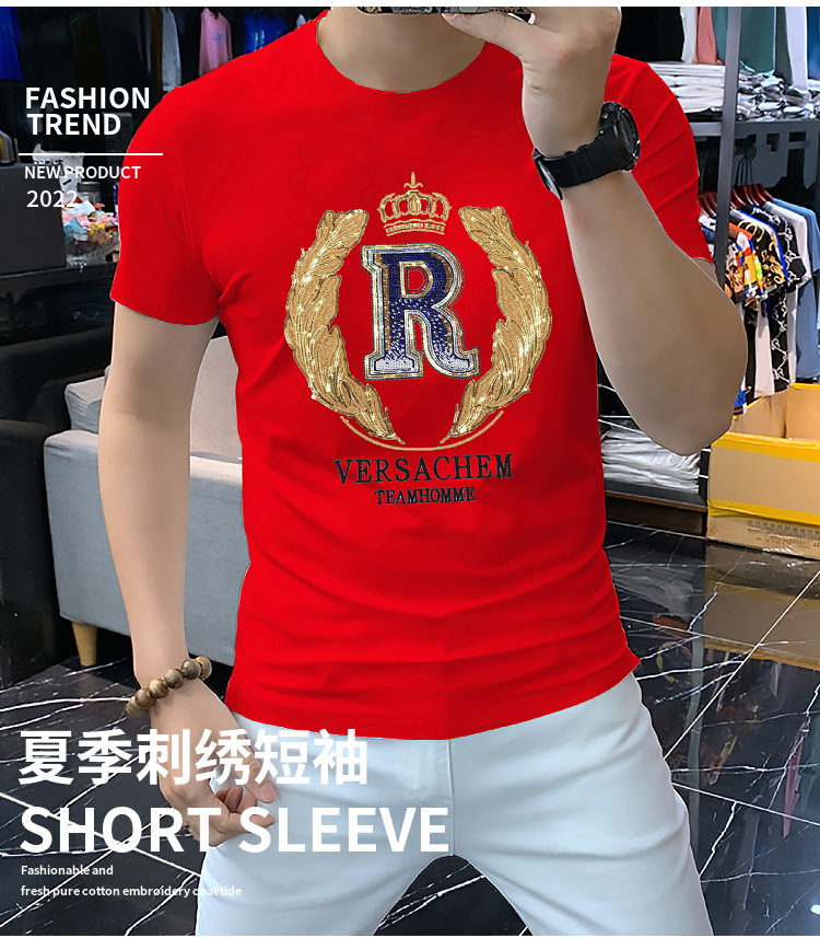 2023 nueva camiseta de manga corta de verano de los hombres de lentejuelas bordadas camisa de cuello redondo en la acción de entrega directa de fábrica superior delgada